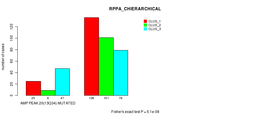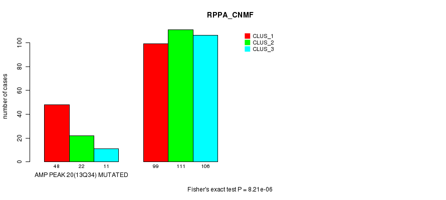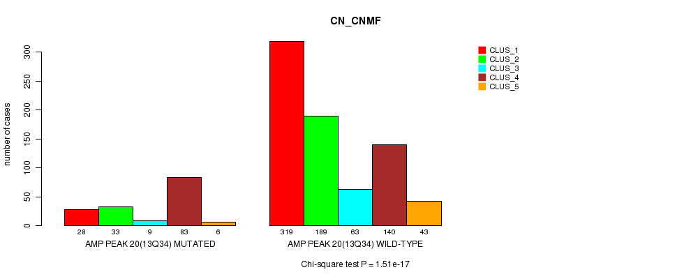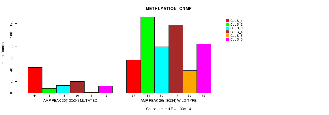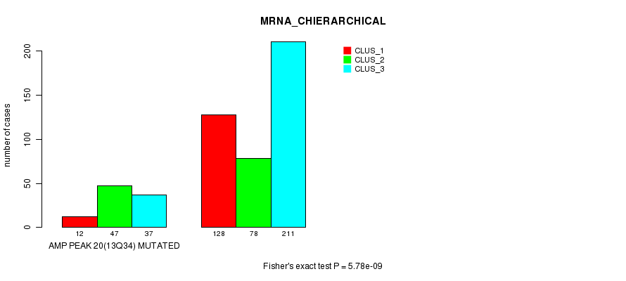 Amp Peak 20(13q34) cnvs correlated to 'MRNA_CNMF', 'MRNA_CHIERARCHICAL', 'CN_CNMF', 'METHLYATION_CNMF', 'RPPA_CNMF', 'RPPA_CHIERARCHICAL', 'MRNASEQ_CNMF', 'MRNASEQ_CHIERARCHICAL', 'MIRSEQ_CNMF', and 'MIRSEQ_CHIERARCHICAL'.