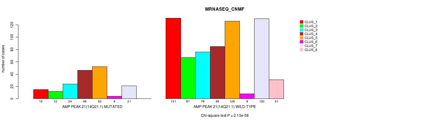 Amp Peak 21(14q21.1) cnvs correlated to 'MRNA_CNMF', 'CN_CNMF', 'METHLYATION_CNMF', 'MRNASEQ_CNMF', 'MRNASEQ_CHIERARCHICAL', and 'MIRSEQ_CNMF'.
