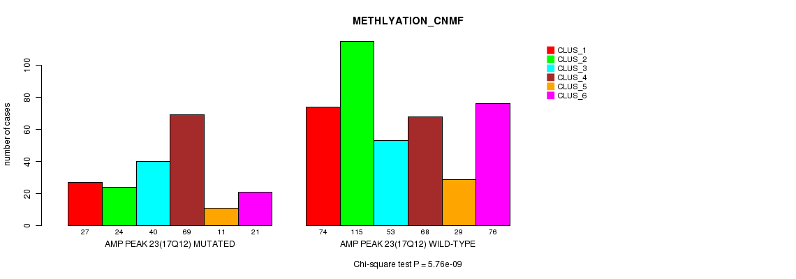 Amp Peak 23(17q12) cnvs correlated to 'MRNA_CNMF', 'MRNA_CHIERARCHICAL', 'CN_CNMF', 'METHLYATION_CNMF', 'MRNASEQ_CNMF', 'MRNASEQ_CHIERARCHICAL', and 'MIRSEQ_CHIERARCHICAL'.
