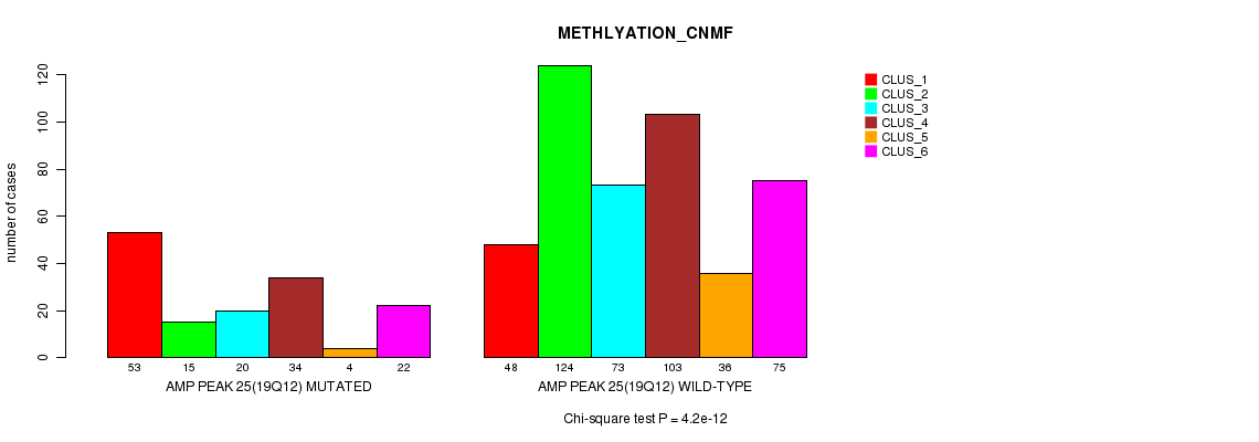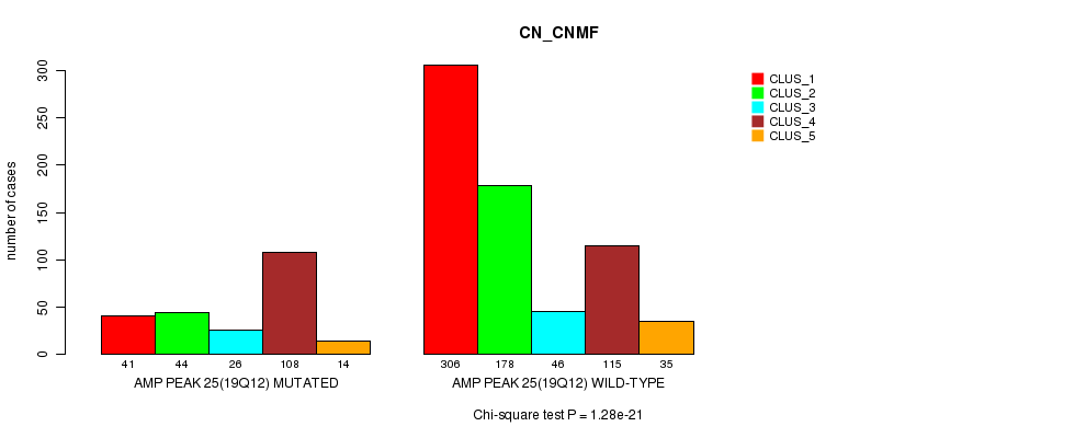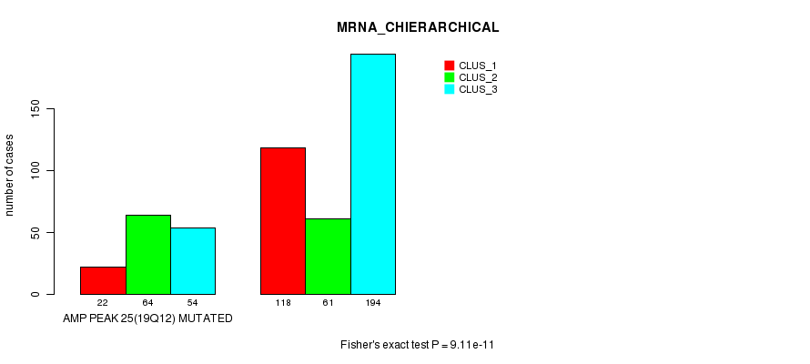 Amp Peak 25(19q12) cnvs correlated to 'MRNA_CNMF', 'MRNA_CHIERARCHICAL', 'CN_CNMF', 'METHLYATION_CNMF', 'RPPA_CNMF', 'RPPA_CHIERARCHICAL', 'MRNASEQ_CNMF', 'MRNASEQ_CHIERARCHICAL', 'MIRSEQ_CNMF', and 'MIRSEQ_CHIERARCHICAL'.