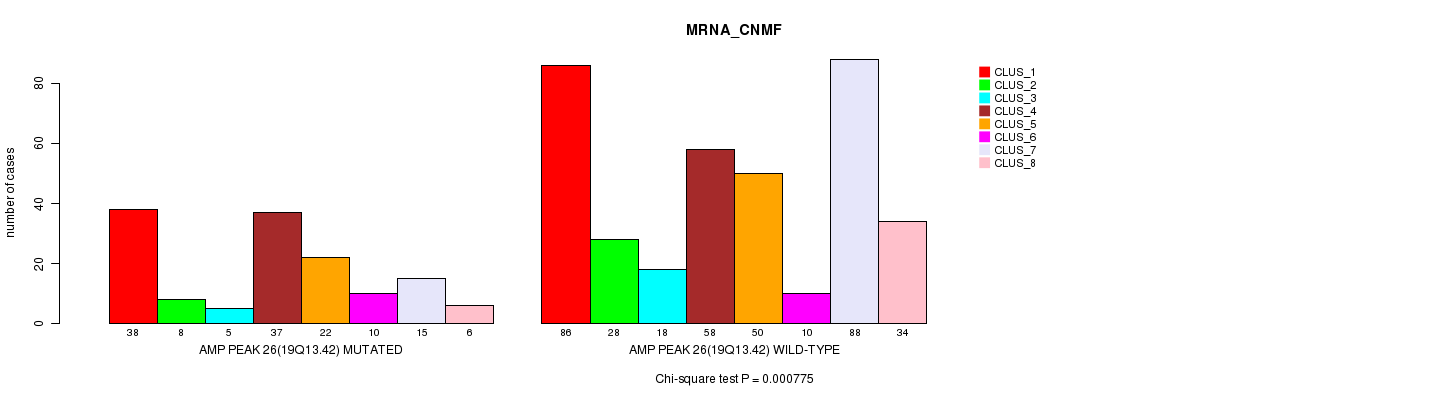 Amp Peak 26(19q13.42) cnvs correlated to 'MRNA_CNMF', 'CN_CNMF', 'METHLYATION_CNMF', 'MRNASEQ_CNMF', 'MIRSEQ_CNMF', and 'MIRSEQ_CHIERARCHICAL'.