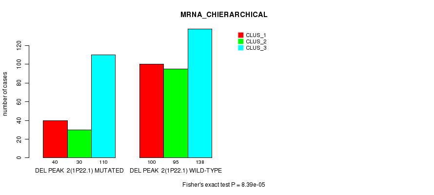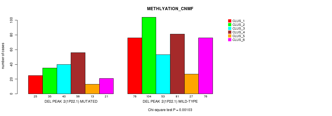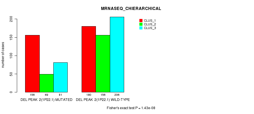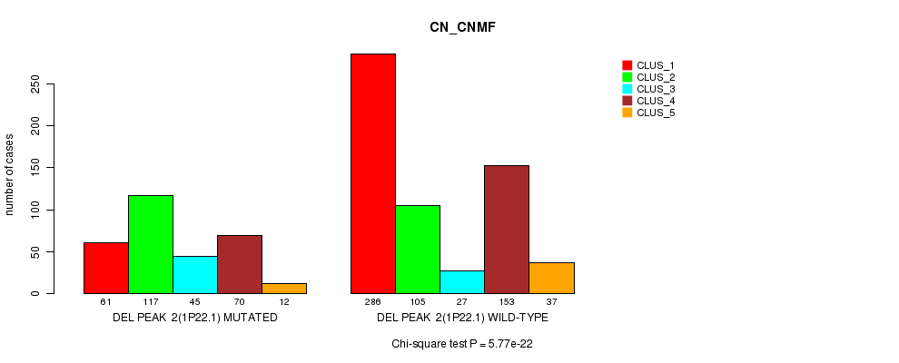 Del Peak 2(1p22.1) cnvs correlated to 'MRNA_CHIERARCHICAL', 'CN_CNMF', 'METHLYATION_CNMF', 'MRNASEQ_CNMF', and 'MRNASEQ_CHIERARCHICAL'.