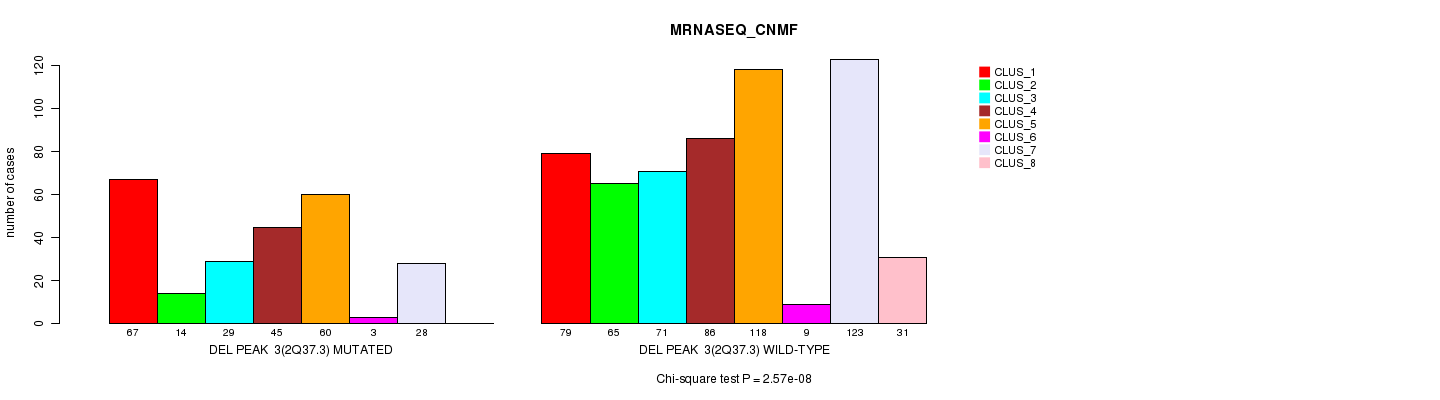 Figure S473. Get High-res Image Gene #63: 'Del Peak 36(21q11.2) mutation analysis' versus Clinical Feature #7: 'MRNASEQ_CNMF'