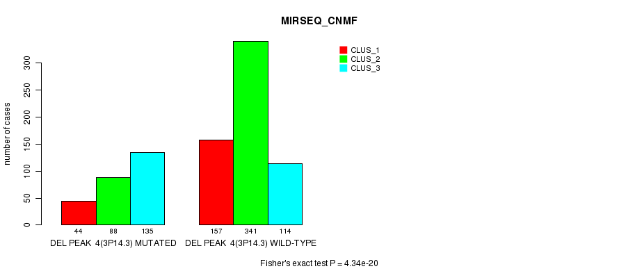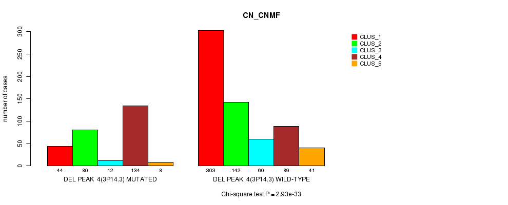 Del Peak 4(3p14.3) cnvs correlated to 'MRNA_CNMF', 'MRNA_CHIERARCHICAL', 'CN_CNMF', 'METHLYATION_CNMF', 'RPPA_CNMF', 'RPPA_CHIERARCHICAL', 'MRNASEQ_CNMF', 'MRNASEQ_CHIERARCHICAL', 'MIRSEQ_CNMF', and 'MIRSEQ_CHIERARCHICAL'.