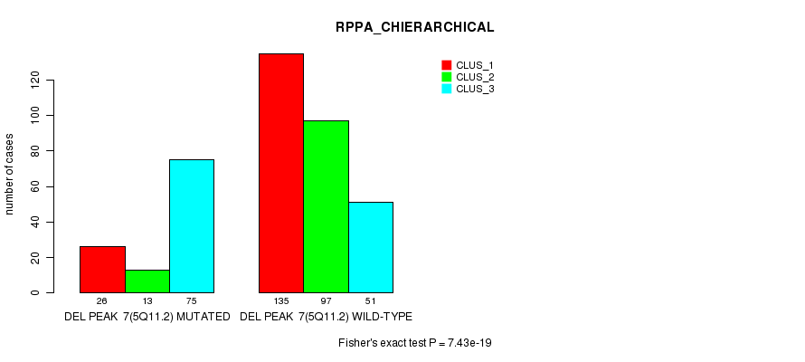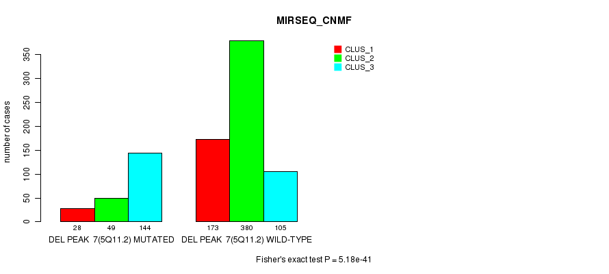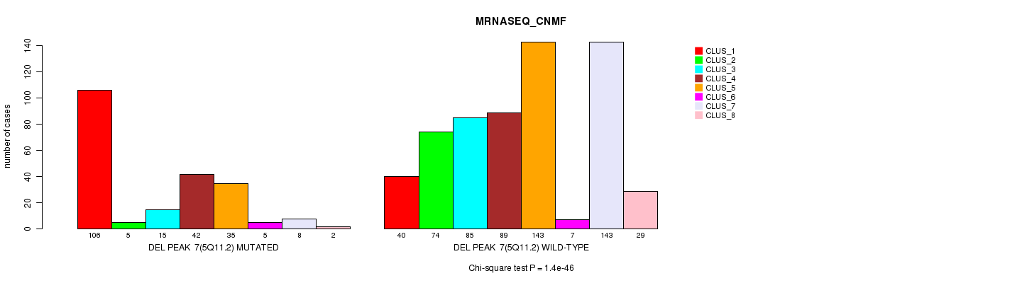 Del Peak 7(5q11.2) cnvs correlated to 'MRNA_CNMF', 'MRNA_CHIERARCHICAL', 'CN_CNMF', 'METHLYATION_CNMF', 'RPPA_CNMF', 'RPPA_CHIERARCHICAL', 'MRNASEQ_CNMF', 'MRNASEQ_CHIERARCHICAL', 'MIRSEQ_CNMF', and 'MIRSEQ_CHIERARCHICAL'.