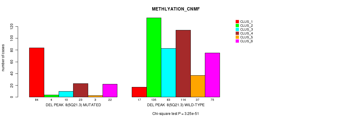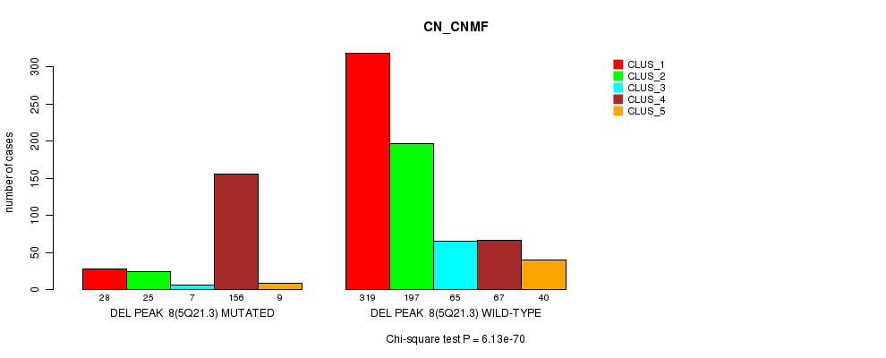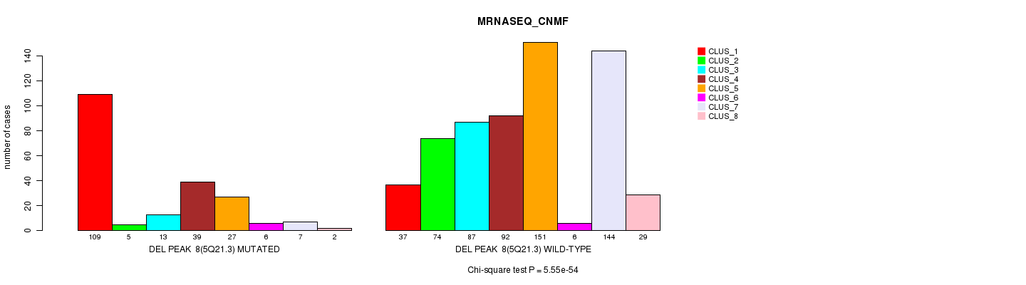 Del Peak 8(5q21.3) cnvs correlated to 'MRNA_CNMF', 'MRNA_CHIERARCHICAL', 'CN_CNMF', 'METHLYATION_CNMF', 'RPPA_CNMF', 'RPPA_CHIERARCHICAL', 'MRNASEQ_CNMF', 'MRNASEQ_CHIERARCHICAL', 'MIRSEQ_CNMF', and 'MIRSEQ_CHIERARCHICAL'.