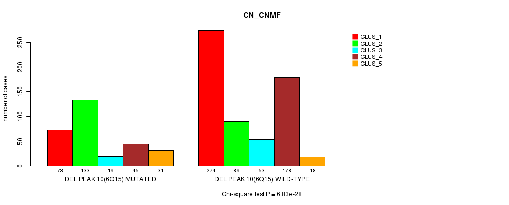 Del Peak 10(6q15) cnvs correlated to 'MRNA_CNMF', 'MRNA_CHIERARCHICAL', 'CN_CNMF', 'METHLYATION_CNMF', 'MRNASEQ_CNMF', 'MRNASEQ_CHIERARCHICAL', and 'MIRSEQ_CHIERARCHICAL'.