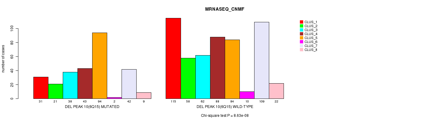 Amp Peak 8(6q21) cnvs correlated to 'MRNA_CNMF', 'MRNA_CHIERARCHICAL', 'CN_CNMF', 'METHLYATION_CNMF', 'RPPA_CNMF', 'RPPA_CHIERARCHICAL', 'MRNASEQ_CNMF', 'MRNASEQ_CHIERARCHICAL', 'MIRSEQ_CNMF', and 'MIRSEQ_CHIERARCHICAL'.