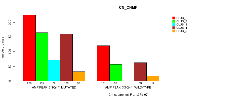 Amp Peak 3(1q44) cnvs correlated to 'MRNA_CNMF', 'CN_CNMF', 'METHLYATION_CNMF', and 'MRNASEQ_CNMF'.
