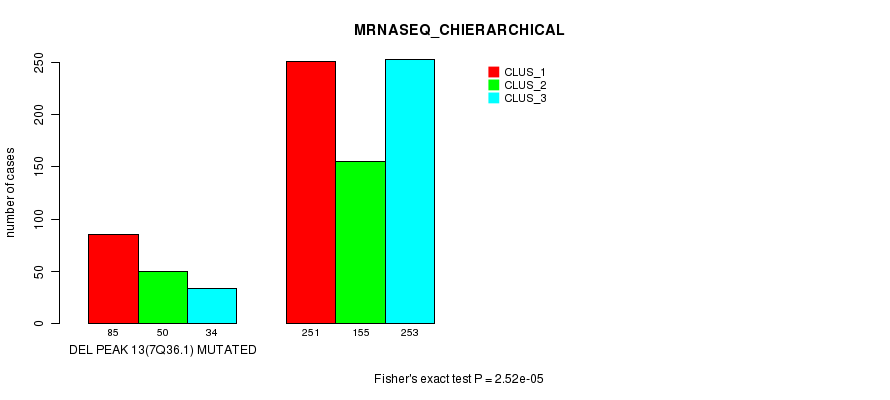 Del Peak 13(7q36.1) cnvs correlated to 'CN_CNMF', 'MRNASEQ_CNMF', 'MRNASEQ_CHIERARCHICAL', 'MIRSEQ_CNMF', and 'MIRSEQ_CHIERARCHICAL'.