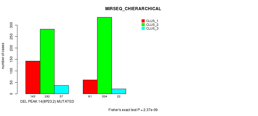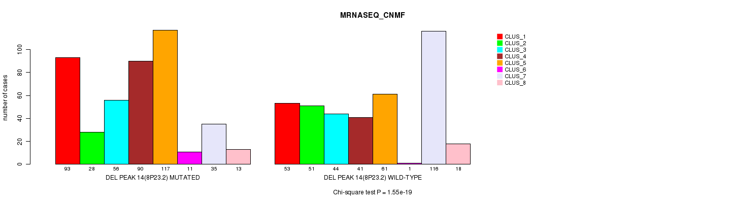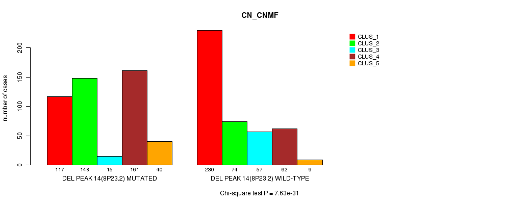 Del Peak 14(8p23.2) cnvs correlated to 'MRNA_CNMF', 'MRNA_CHIERARCHICAL', 'CN_CNMF', 'METHLYATION_CNMF', 'MRNASEQ_CNMF', 'MRNASEQ_CHIERARCHICAL', 'MIRSEQ_CNMF', and 'MIRSEQ_CHIERARCHICAL'.