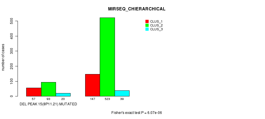 Del Peak 15(8p11.21) cnvs correlated to 'MRNA_CNMF', 'CN_CNMF', 'MRNASEQ_CNMF', 'MRNASEQ_CHIERARCHICAL', and 'MIRSEQ_CHIERARCHICAL'.