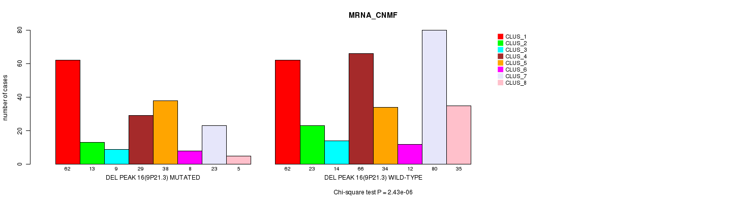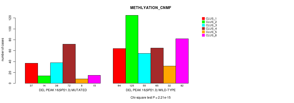 Del Peak 16(9p21.3) cnvs correlated to 'MRNA_CNMF', 'MRNA_CHIERARCHICAL', 'CN_CNMF', 'METHLYATION_CNMF', 'MRNASEQ_CNMF', 'MRNASEQ_CHIERARCHICAL', 'MIRSEQ_CNMF', and 'MIRSEQ_CHIERARCHICAL'.