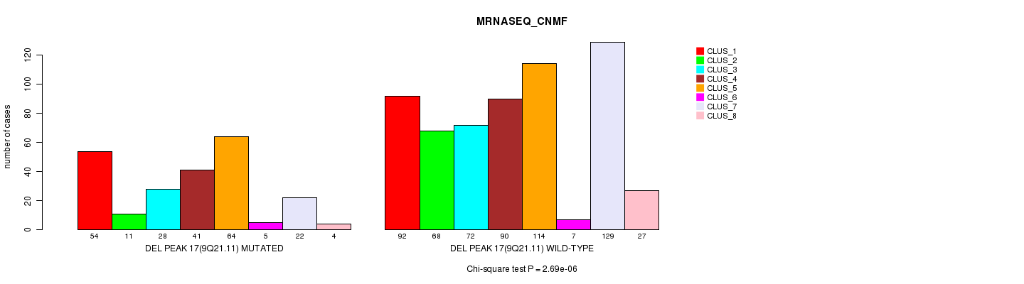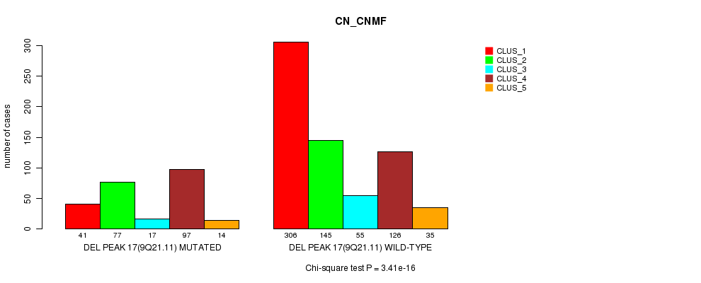 Del Peak 17(9q21.11) cnvs correlated to 'MRNA_CHIERARCHICAL', 'CN_CNMF', 'METHLYATION_CNMF', 'RPPA_CNMF', 'MRNASEQ_CNMF', 'MRNASEQ_CHIERARCHICAL', 'MIRSEQ_CNMF', and 'MIRSEQ_CHIERARCHICAL'.