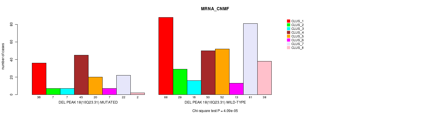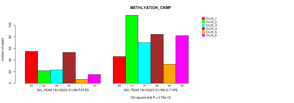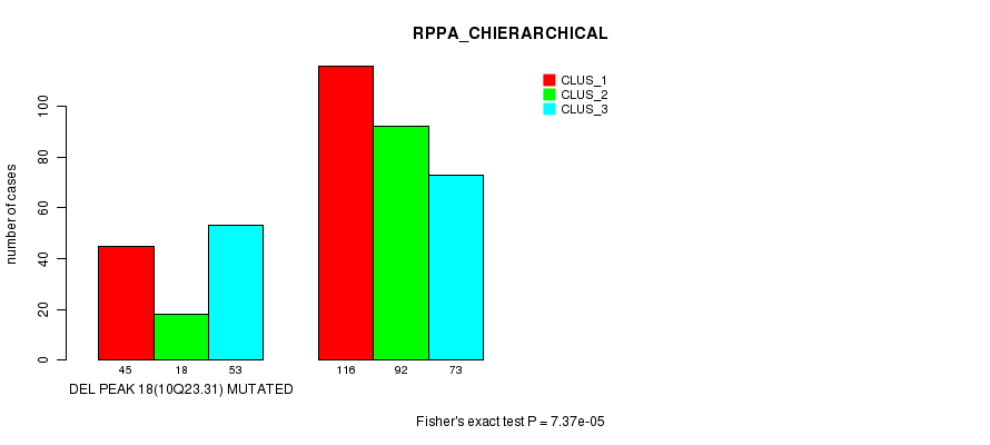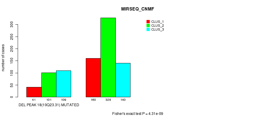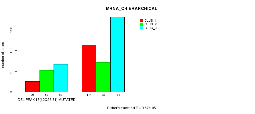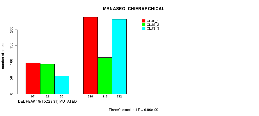 Del Peak 18(10q23.31) cnvs correlated to 'MRNA_CNMF', 'MRNA_CHIERARCHICAL', 'CN_CNMF', 'METHLYATION_CNMF', 'RPPA_CNMF', 'RPPA_CHIERARCHICAL', 'MRNASEQ_CNMF', 'MRNASEQ_CHIERARCHICAL', 'MIRSEQ_CNMF', and 'MIRSEQ_CHIERARCHICAL'.