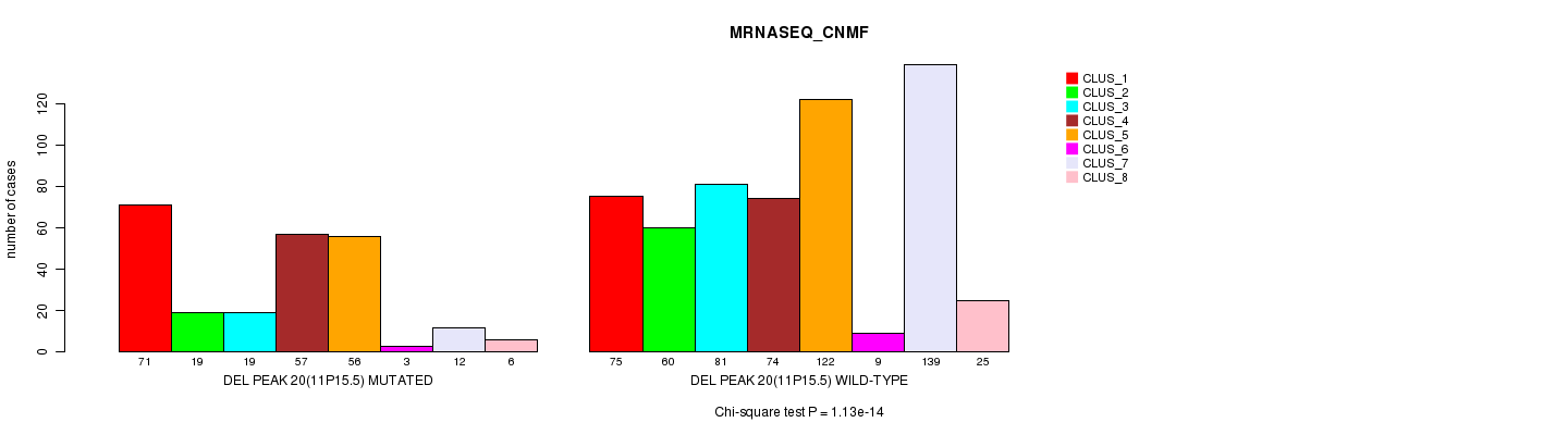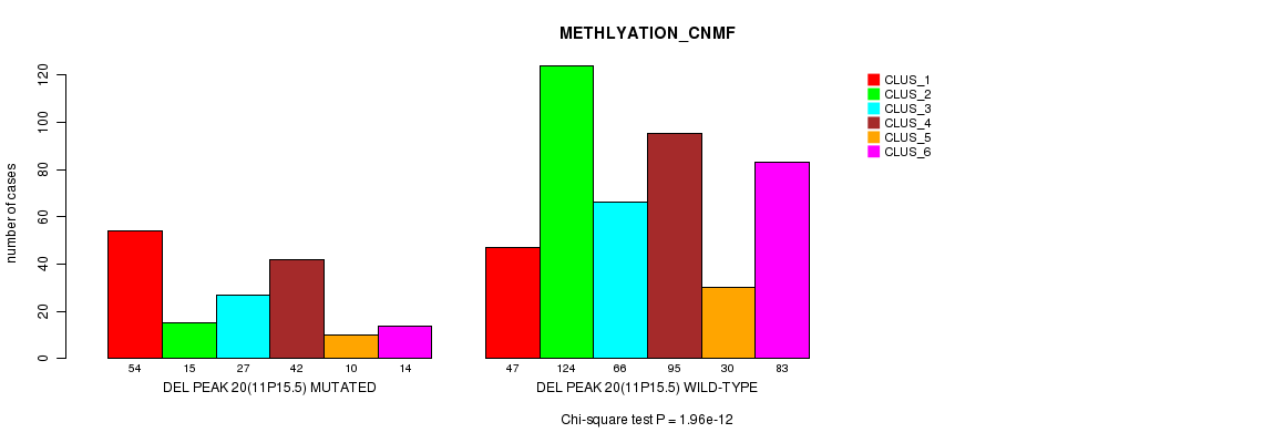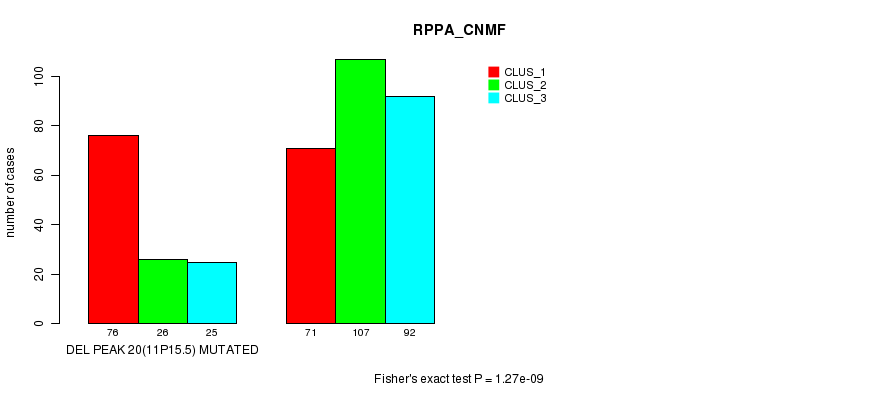 Del Peak 20(11p15.5) cnvs correlated to 'MRNA_CNMF', 'MRNA_CHIERARCHICAL', 'CN_CNMF', 'METHLYATION_CNMF', 'RPPA_CNMF', 'RPPA_CHIERARCHICAL', 'MRNASEQ_CNMF', 'MRNASEQ_CHIERARCHICAL', 'MIRSEQ_CNMF', and 'MIRSEQ_CHIERARCHICAL'.