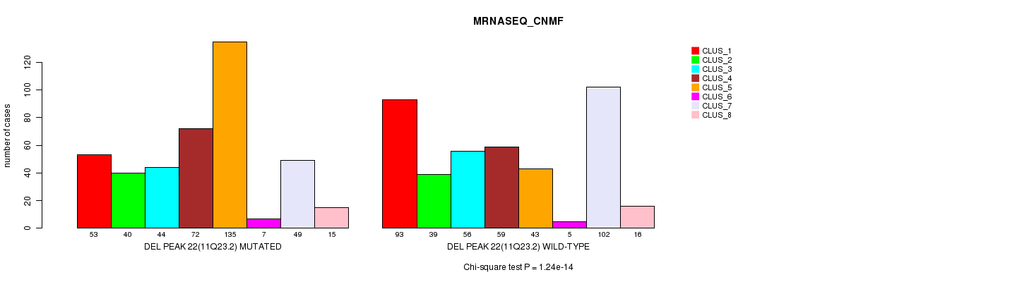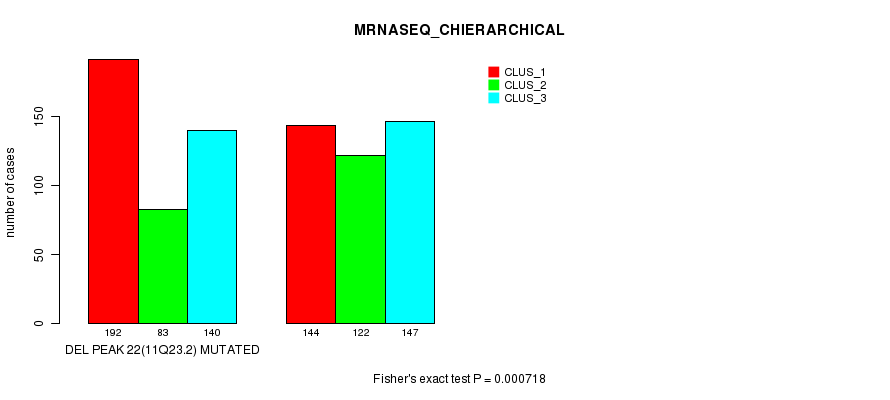 Del Peak 22(11q23.2) cnvs correlated to 'MRNA_CNMF', 'CN_CNMF', 'METHLYATION_CNMF', 'MRNASEQ_CNMF', and 'MRNASEQ_CHIERARCHICAL'.