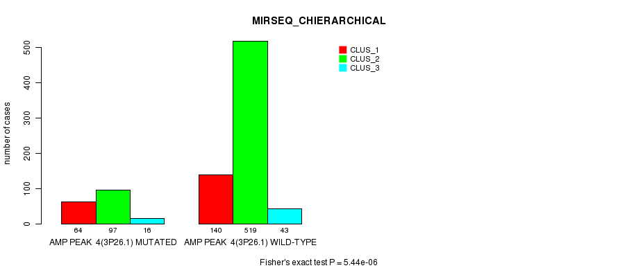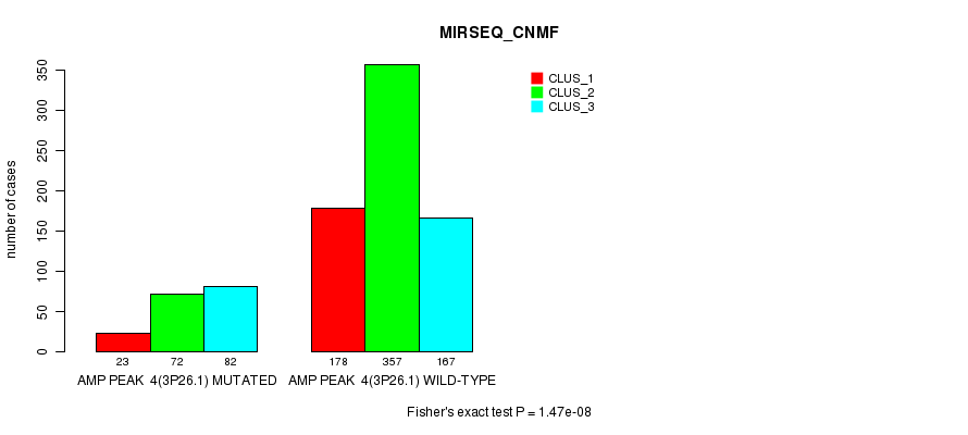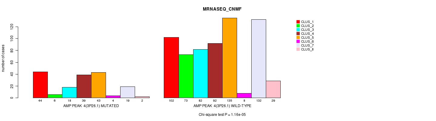 Amp Peak 4(3p26.1) cnvs correlated to 'CN_CNMF', 'METHLYATION_CNMF', 'MRNASEQ_CNMF', 'MRNASEQ_CHIERARCHICAL', 'MIRSEQ_CNMF', and 'MIRSEQ_CHIERARCHICAL'.