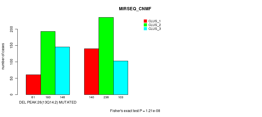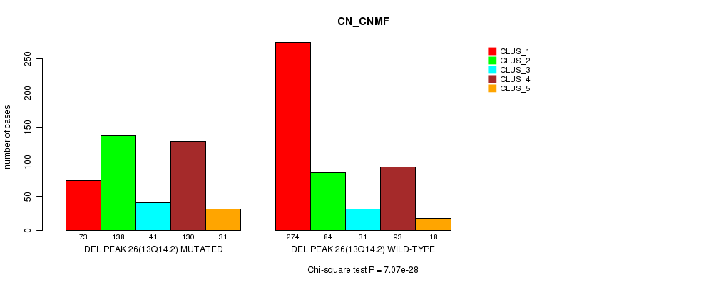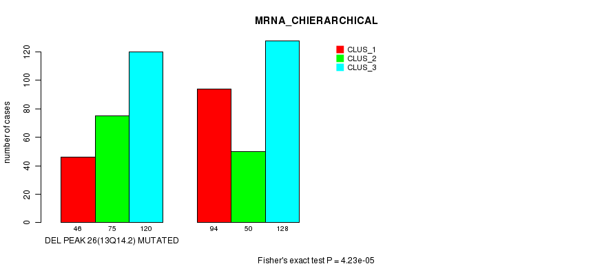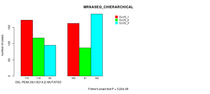 Del Peak 26(13q14.2) cnvs correlated to 'MRNA_CNMF', 'MRNA_CHIERARCHICAL', 'CN_CNMF', 'METHLYATION_CNMF', 'MRNASEQ_CNMF', 'MRNASEQ_CHIERARCHICAL', 'MIRSEQ_CNMF', and 'MIRSEQ_CHIERARCHICAL'.