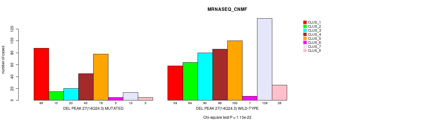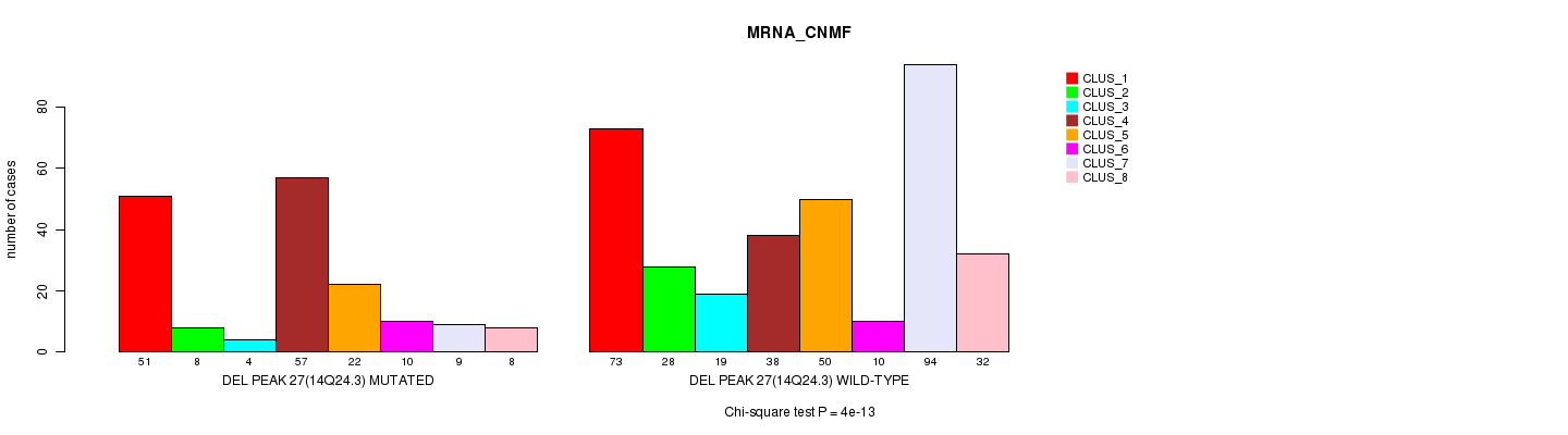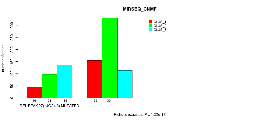 Del Peak 27(14q24.3) cnvs correlated to 'MRNA_CNMF', 'MRNA_CHIERARCHICAL', 'CN_CNMF', 'METHLYATION_CNMF', 'RPPA_CNMF', 'RPPA_CHIERARCHICAL', 'MRNASEQ_CNMF', 'MRNASEQ_CHIERARCHICAL', 'MIRSEQ_CNMF', and 'MIRSEQ_CHIERARCHICAL'.