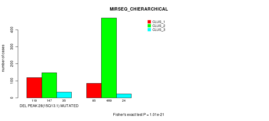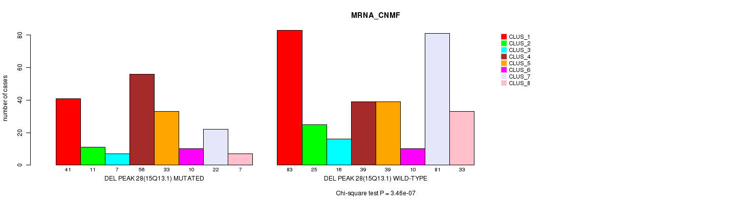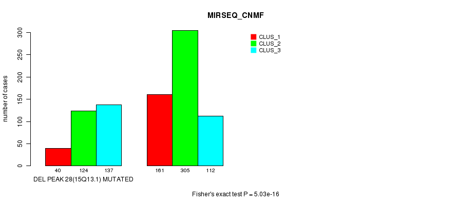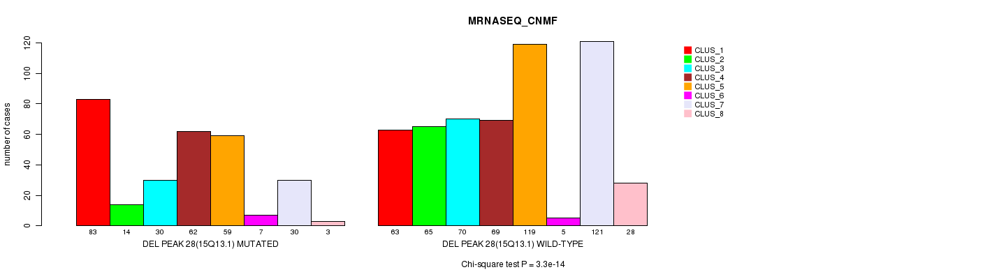 Del Peak 28(15q13.1) cnvs correlated to 'MRNA_CNMF', 'MRNA_CHIERARCHICAL', 'CN_CNMF', 'METHLYATION_CNMF', 'RPPA_CNMF', 'RPPA_CHIERARCHICAL', 'MRNASEQ_CNMF', 'MRNASEQ_CHIERARCHICAL', 'MIRSEQ_CNMF', and 'MIRSEQ_CHIERARCHICAL'.