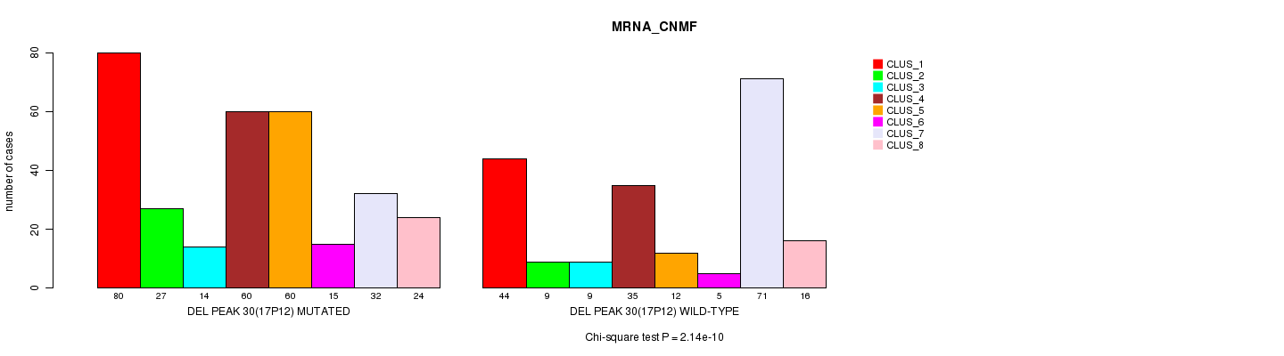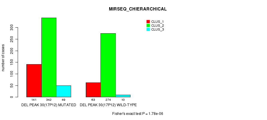 Del Peak 30(17p12) cnvs correlated to 'MRNA_CNMF', 'CN_CNMF', 'METHLYATION_CNMF', 'RPPA_CNMF', 'MRNASEQ_CNMF', 'MIRSEQ_CNMF', and 'MIRSEQ_CHIERARCHICAL'.