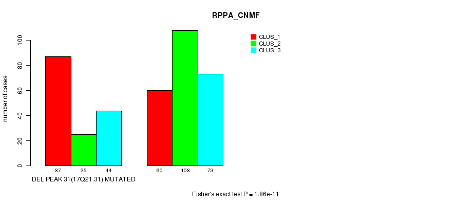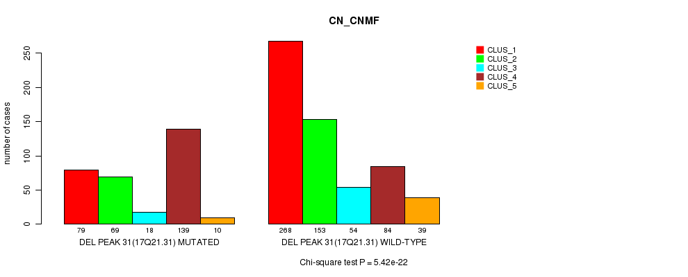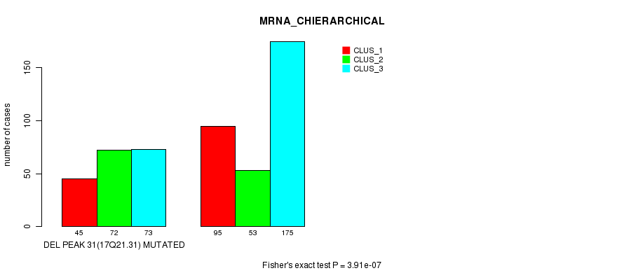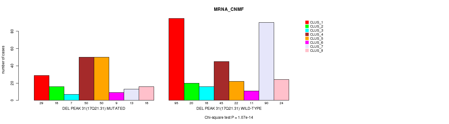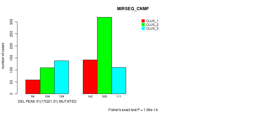 Del Peak 31(17q21.31) cnvs correlated to 'MRNA_CNMF', 'MRNA_CHIERARCHICAL', 'CN_CNMF', 'METHLYATION_CNMF', 'RPPA_CNMF', 'RPPA_CHIERARCHICAL', 'MRNASEQ_CNMF', 'MRNASEQ_CHIERARCHICAL', 'MIRSEQ_CNMF', and 'MIRSEQ_CHIERARCHICAL'.