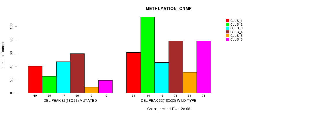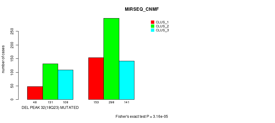 Del Peak 32(18q23) cnvs correlated to 'MRNA_CNMF', 'CN_CNMF', 'METHLYATION_CNMF', 'MRNASEQ_CNMF', 'MRNASEQ_CHIERARCHICAL', 'MIRSEQ_CNMF', and 'MIRSEQ_CHIERARCHICAL'.