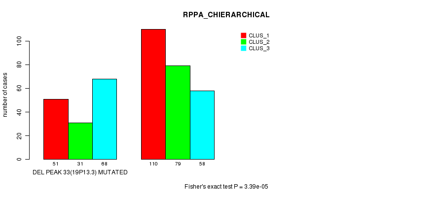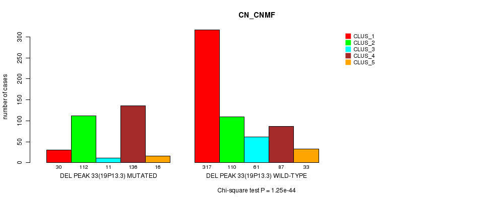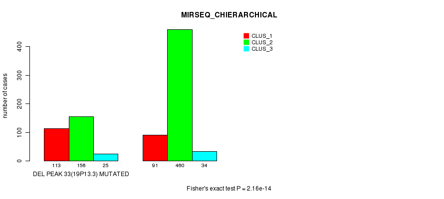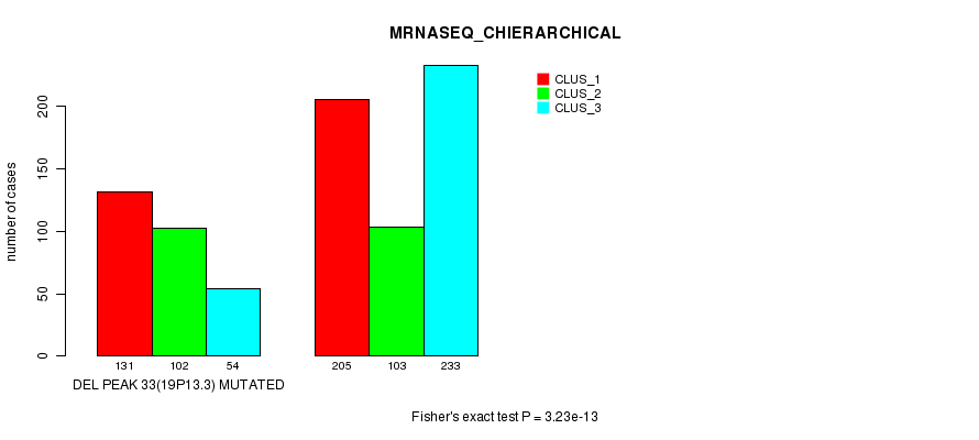 Del Peak 33(19p13.3) cnvs correlated to 'MRNA_CNMF', 'MRNA_CHIERARCHICAL', 'CN_CNMF', 'METHLYATION_CNMF', 'RPPA_CNMF', 'RPPA_CHIERARCHICAL', 'MRNASEQ_CNMF', 'MRNASEQ_CHIERARCHICAL', 'MIRSEQ_CNMF', and 'MIRSEQ_CHIERARCHICAL'.