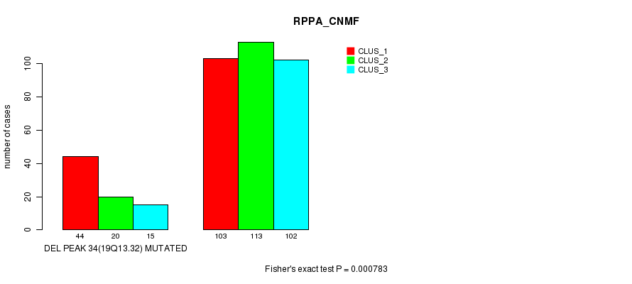Del Peak 34(19q13.32) cnvs correlated to 'MRNA_CNMF', 'MRNA_CHIERARCHICAL', 'CN_CNMF', 'METHLYATION_CNMF', 'RPPA_CNMF', 'RPPA_CHIERARCHICAL', 'MRNASEQ_CNMF', 'MRNASEQ_CHIERARCHICAL', 'MIRSEQ_CNMF', and 'MIRSEQ_CHIERARCHICAL'.