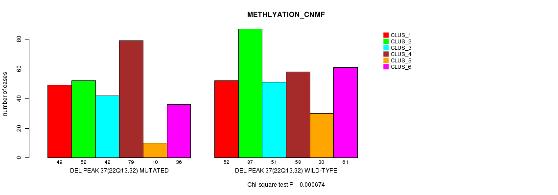 Figure S474. Get High-res Image Gene #64: 'Del Peak 37(22q13.32) mutation analysis' versus Clinical Feature #4: 'METHLYATION_CNMF'