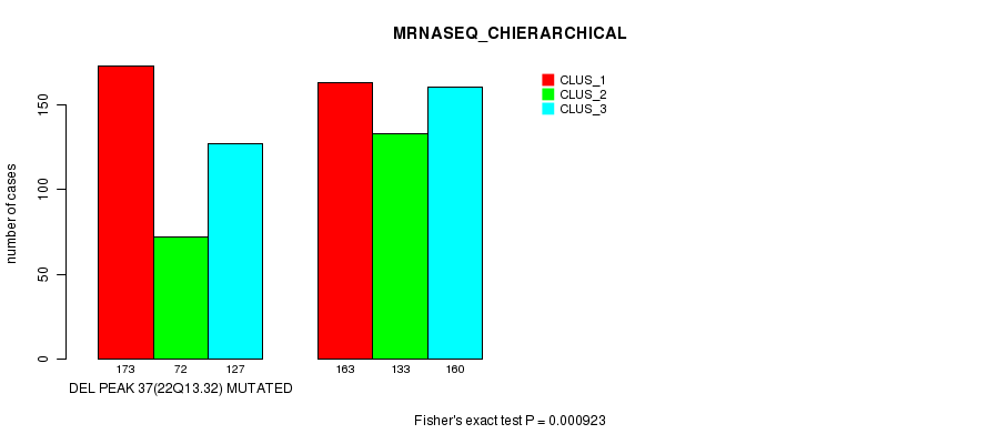 Figure S475. Get High-res Image Gene #64: 'Del Peak 37(22q13.32) mutation analysis' versus Clinical Feature #8: 'MRNASEQ_CHIERARCHICAL'