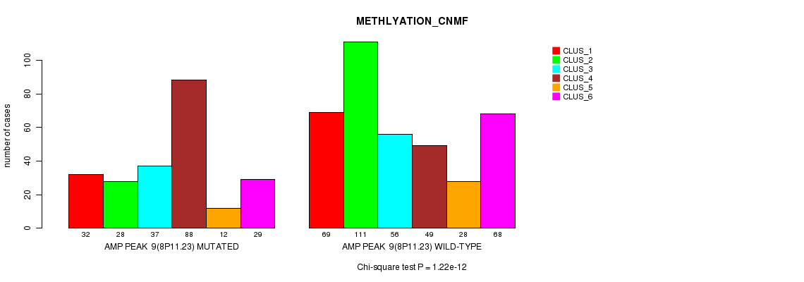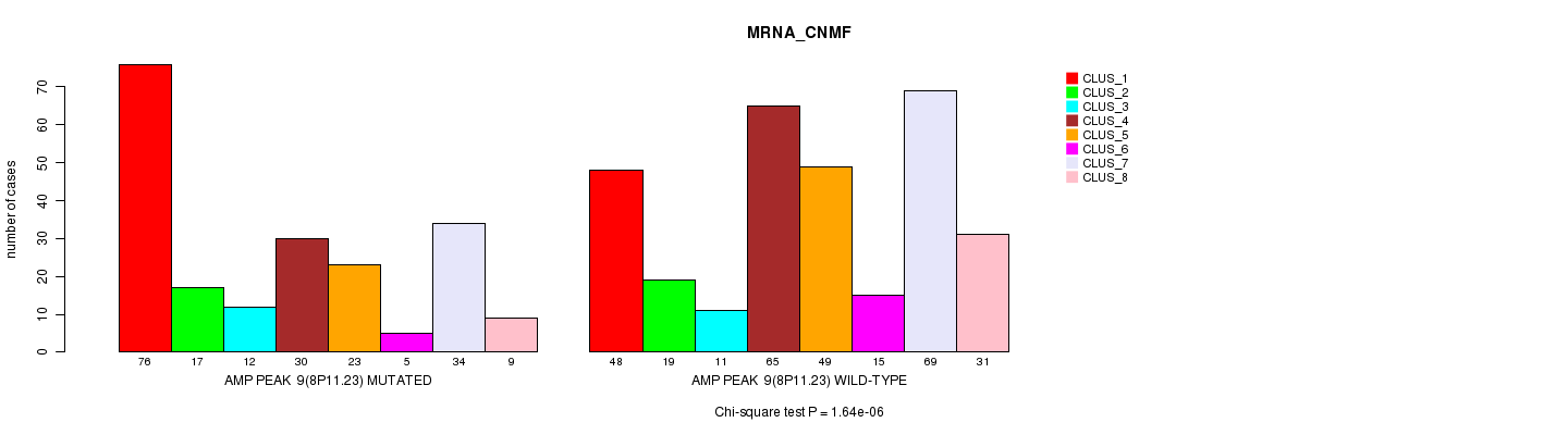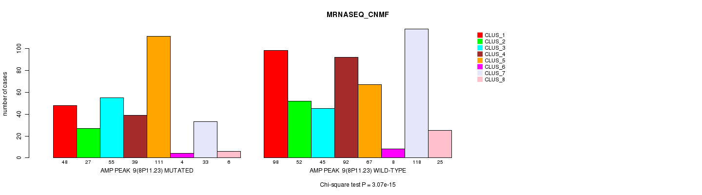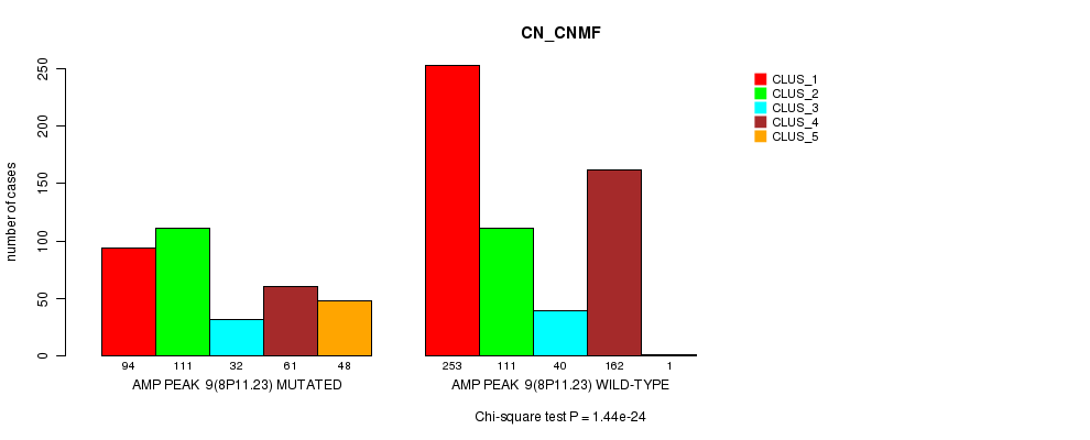Amp Peak 9(8p11.23) cnvs correlated to 'MRNA_CNMF', 'CN_CNMF', 'METHLYATION_CNMF', 'MRNASEQ_CNMF', and 'MRNASEQ_CHIERARCHICAL'.