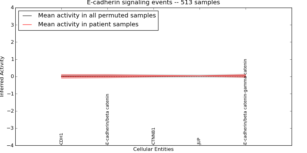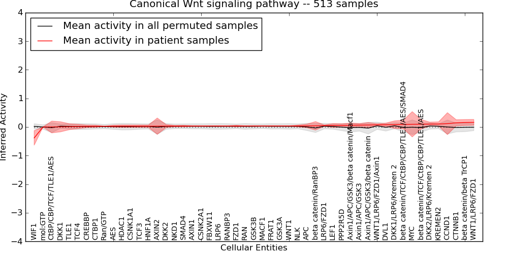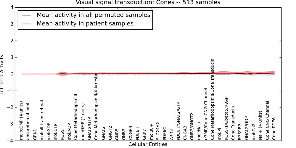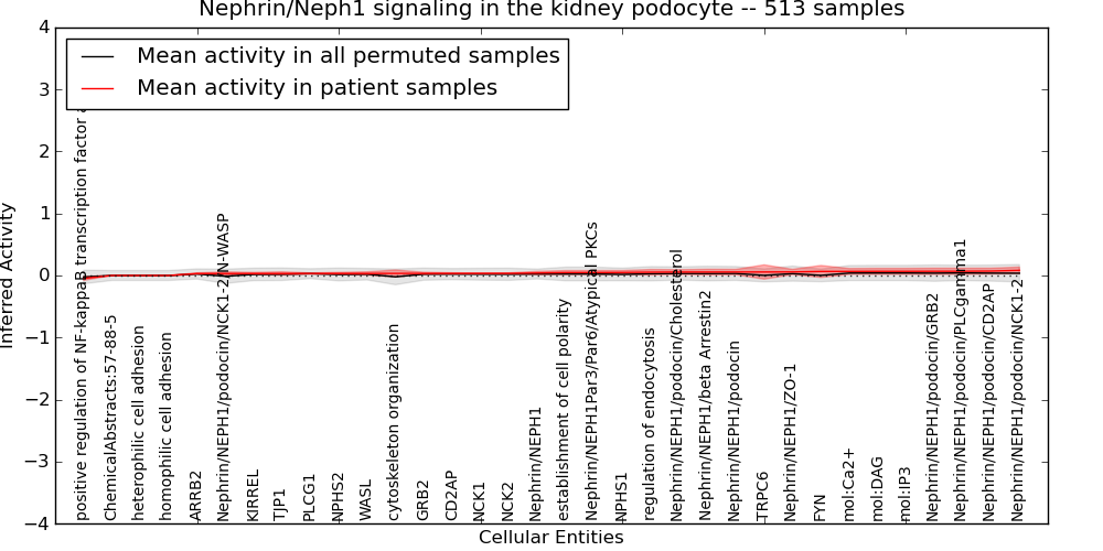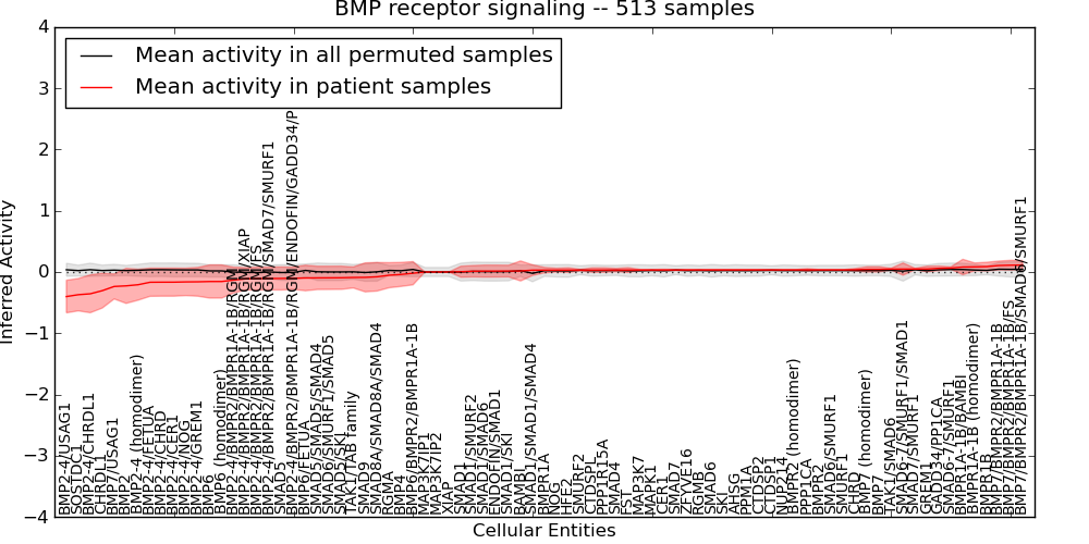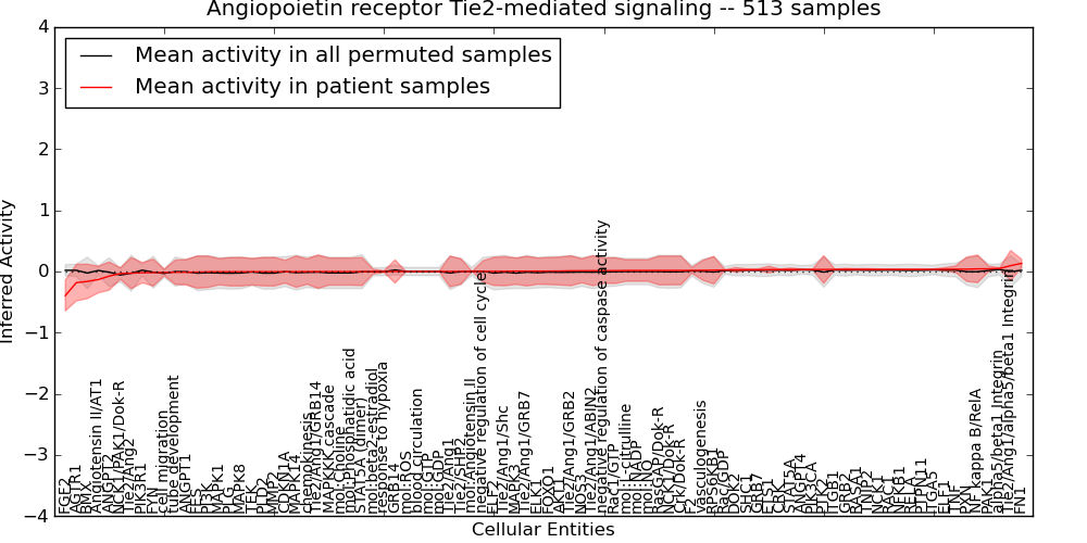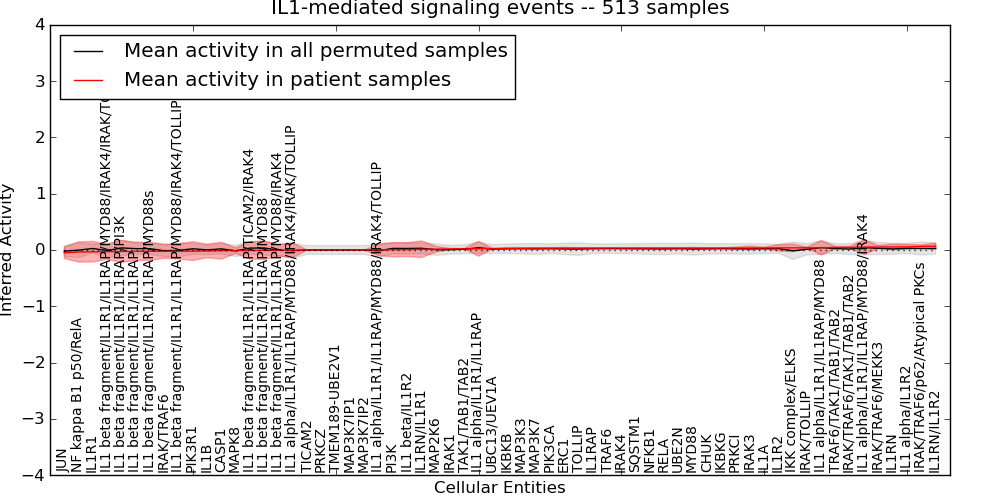 Figure S131. Get High-res Image This plot shows pathway concept perturbations across all samples against a permutation model. The concepts along the x-axis are sorted by lowest to highest mean activity for the real patient samples. Mean inferred activities are plotted along the y-axis as a colored band showing the average level and one standard deviation range. Real samples are shown in red and permuted samples in black.