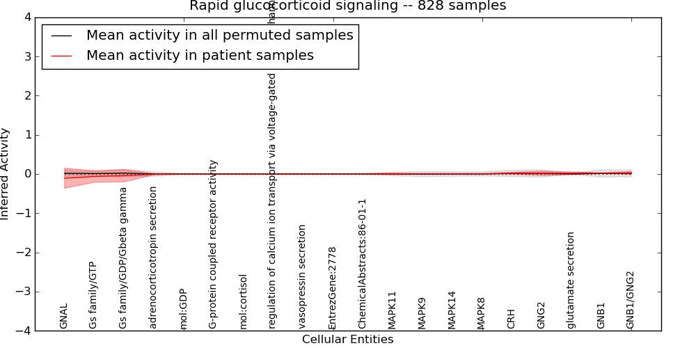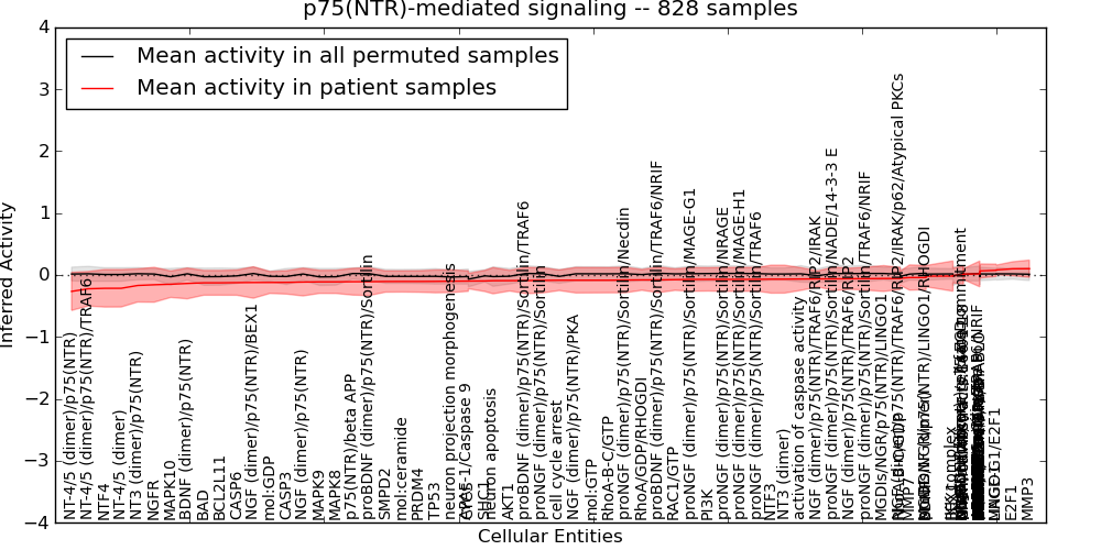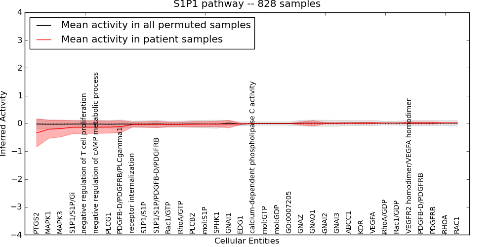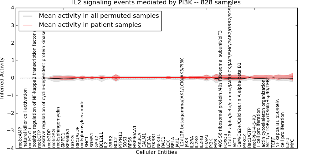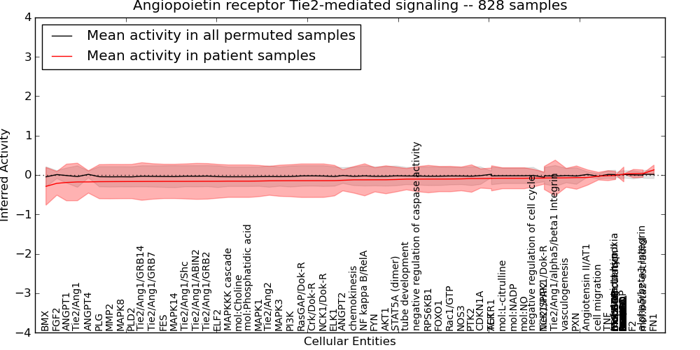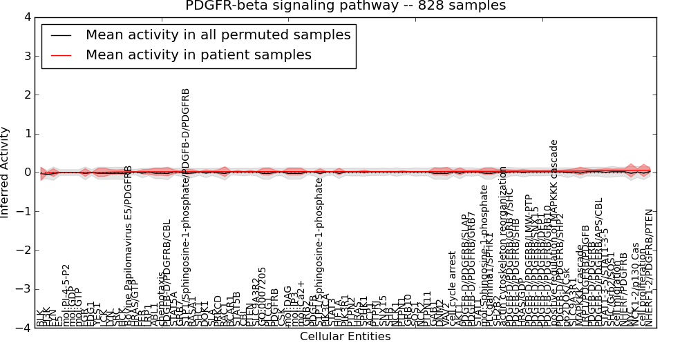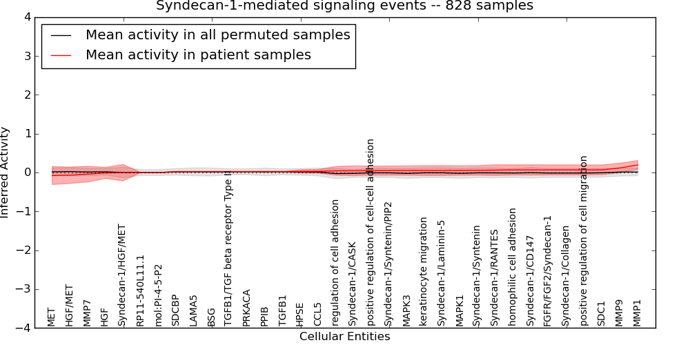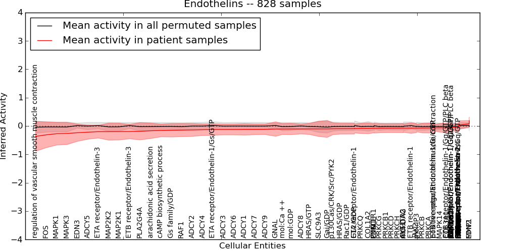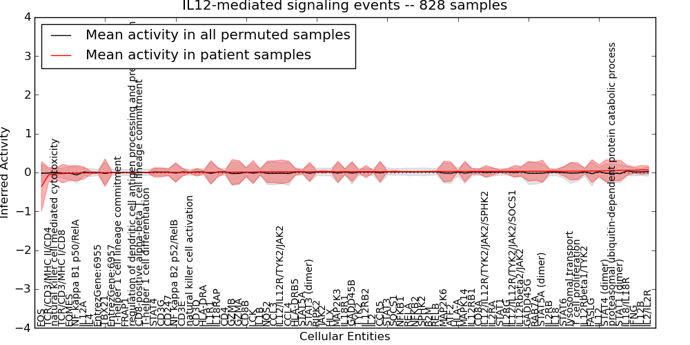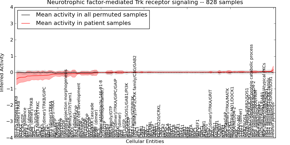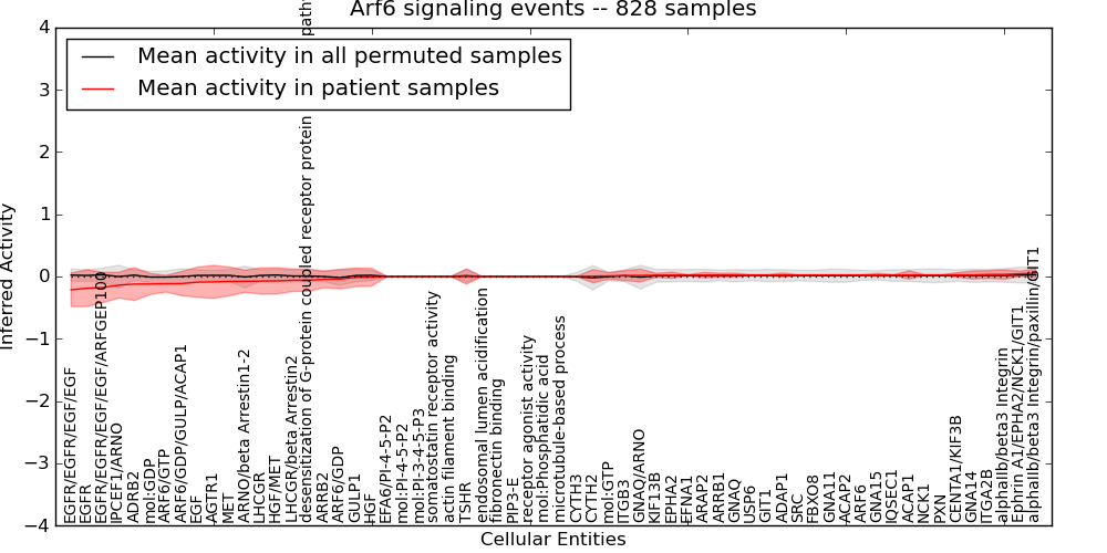 Figure S131. Get High-res Image This plot shows pathway concept perturbations across all samples against a permutation model. The concepts along the x-axis are sorted by lowest to highest mean activity for the real patient samples. Mean inferred activities are plotted along the y-axis as a colored band showing the average level and one standard deviation range. Real samples are shown in red and permuted samples in black.