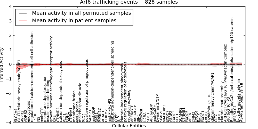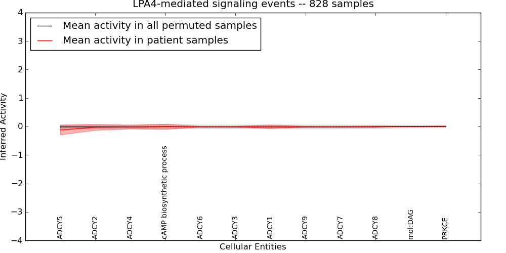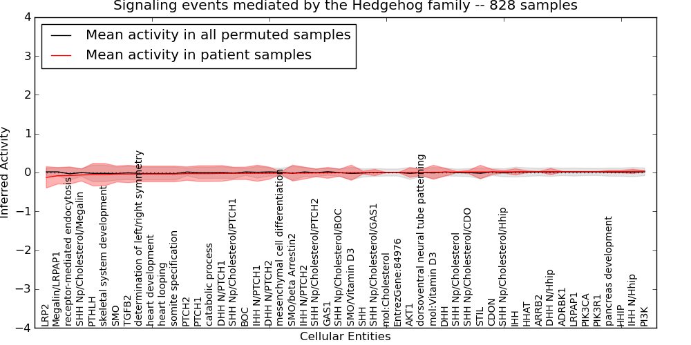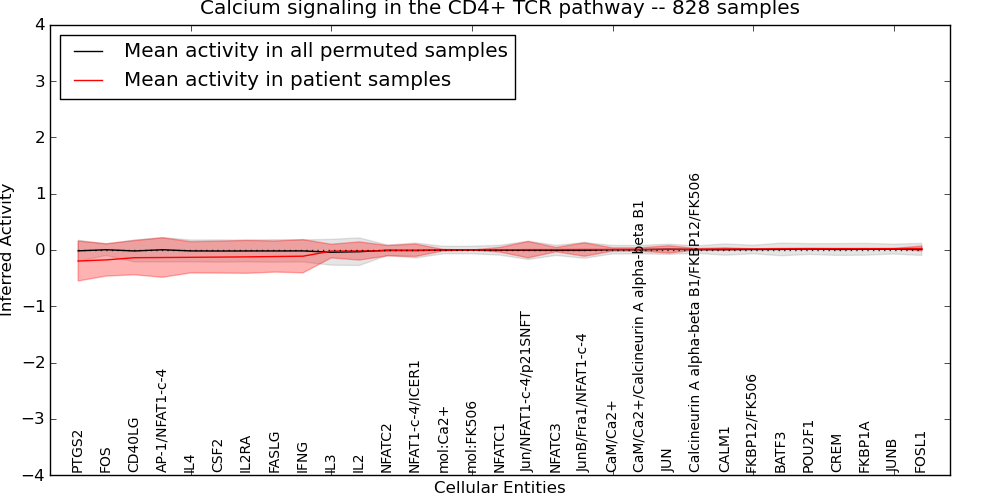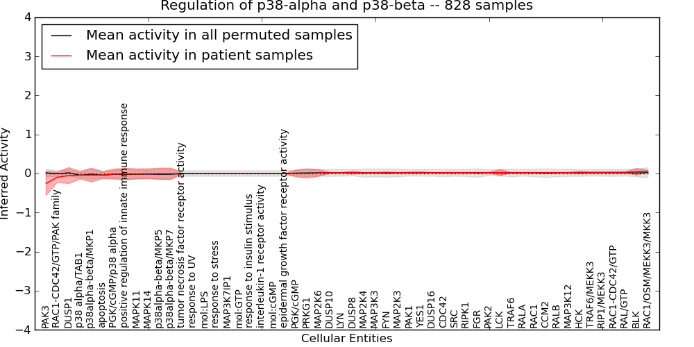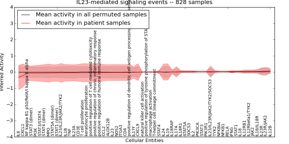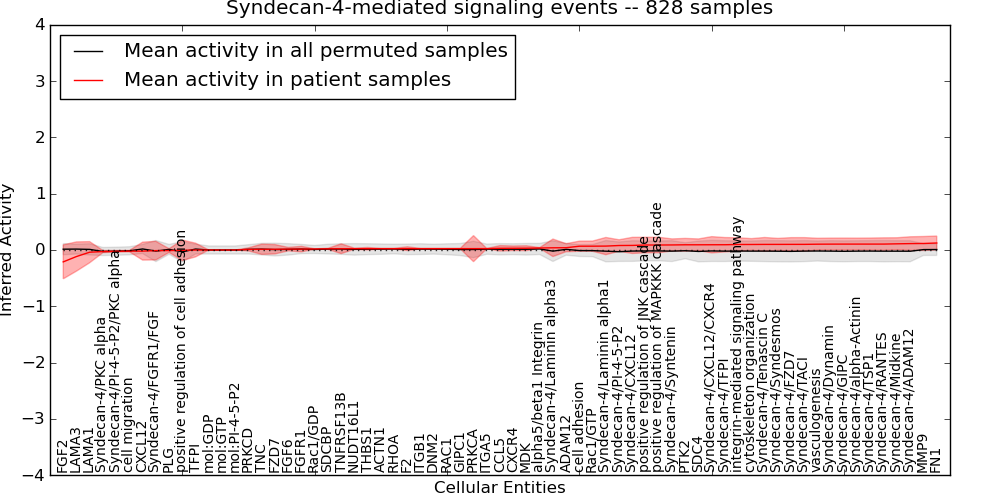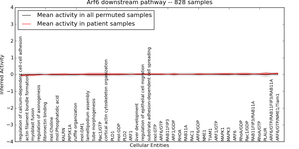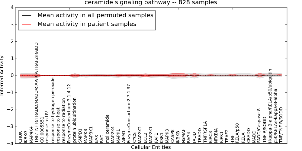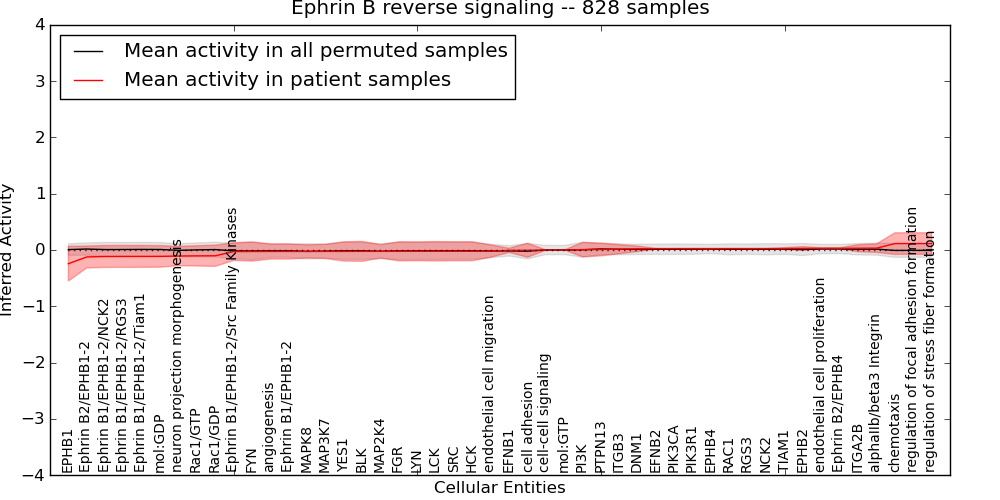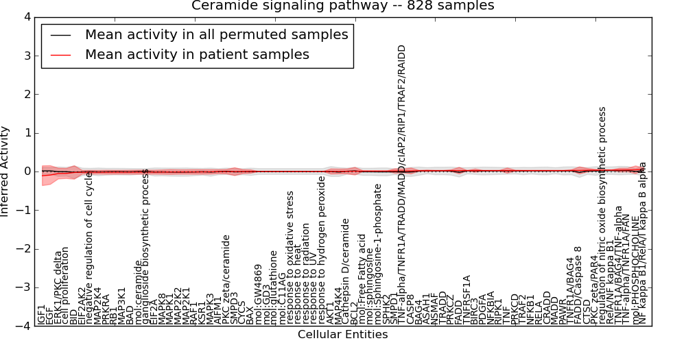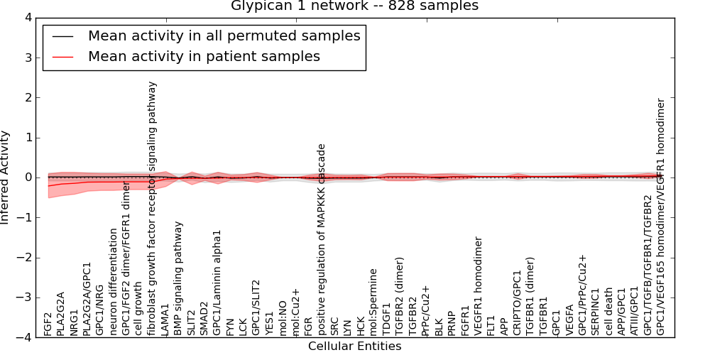 Figure S131. Get High-res Image This plot shows pathway concept perturbations across all samples against a permutation model. The concepts along the x-axis are sorted by lowest to highest mean activity for the real patient samples. Mean inferred activities are plotted along the y-axis as a colored band showing the average level and one standard deviation range. Real samples are shown in red and permuted samples in black.
