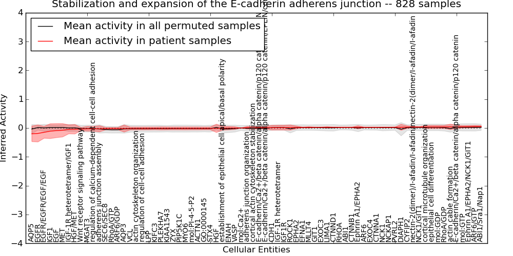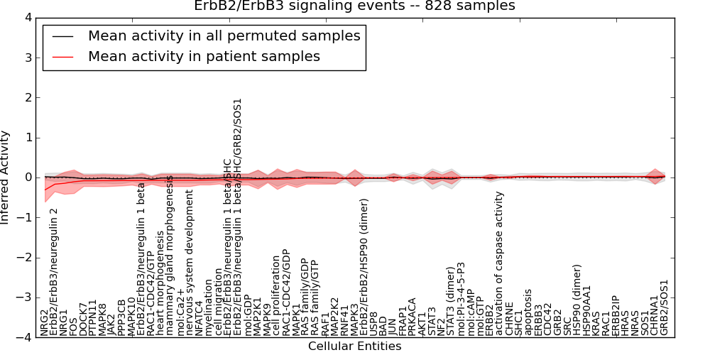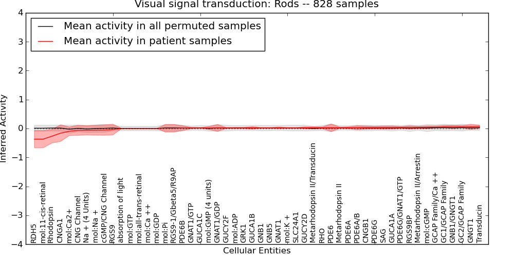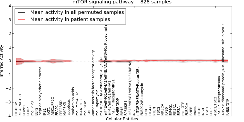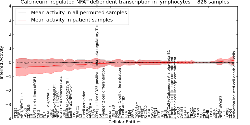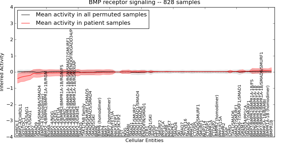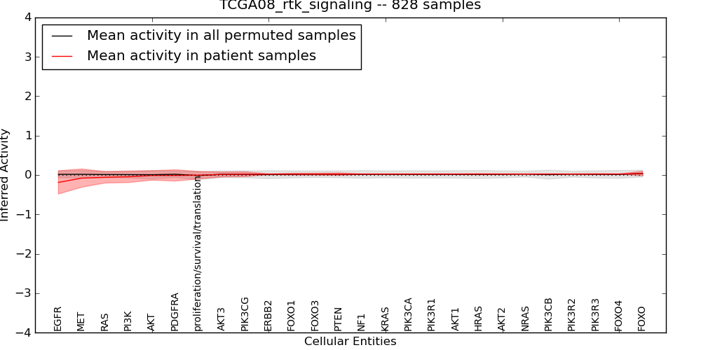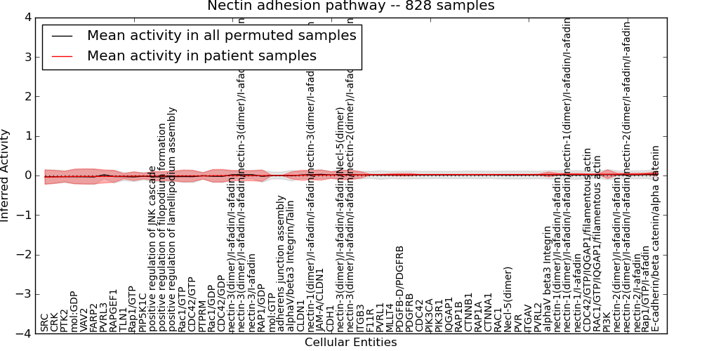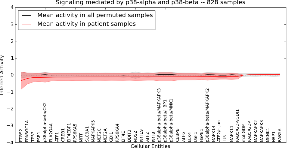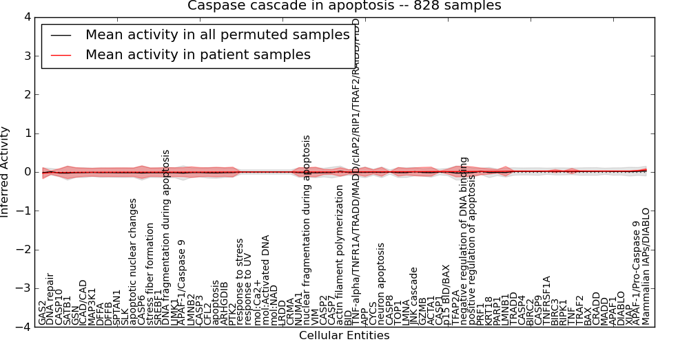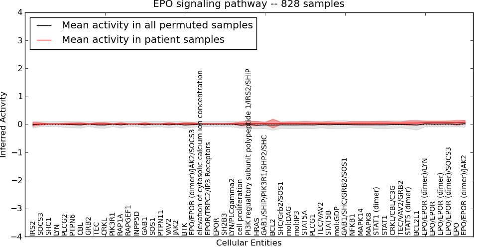 Figure S131. Get High-res Image This plot shows pathway concept perturbations across all samples against a permutation model. The concepts along the x-axis are sorted by lowest to highest mean activity for the real patient samples. Mean inferred activities are plotted along the y-axis as a colored band showing the average level and one standard deviation range. Real samples are shown in red and permuted samples in black.