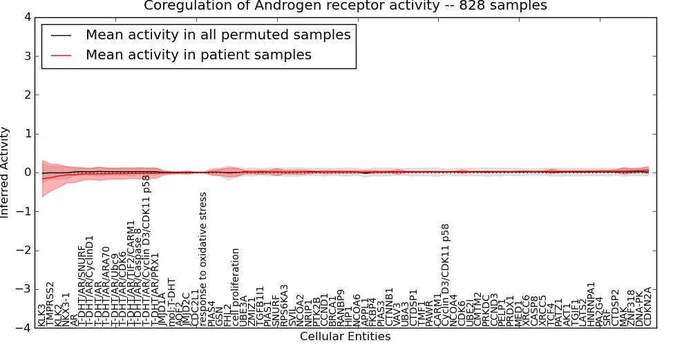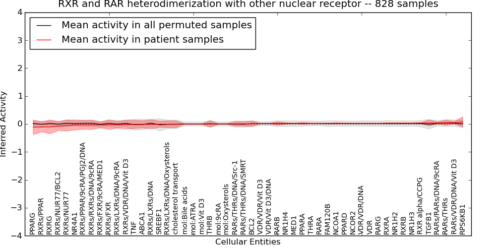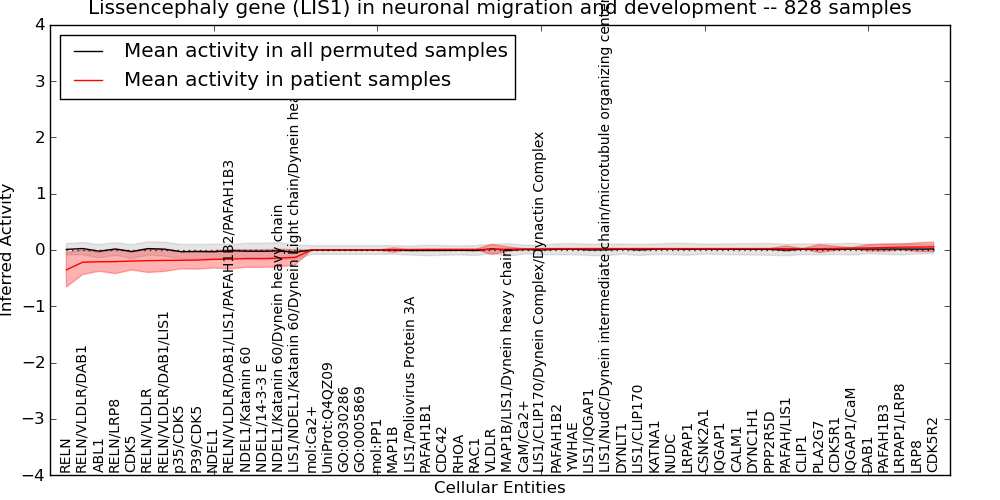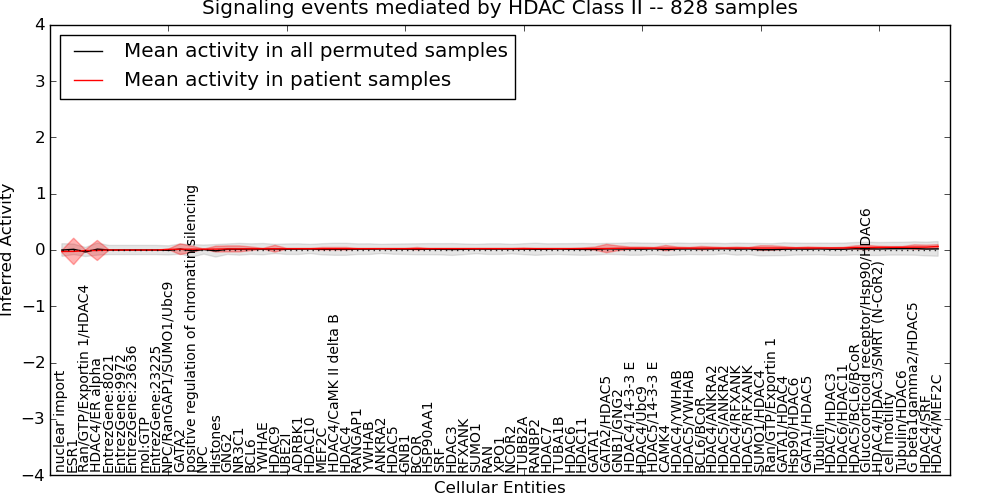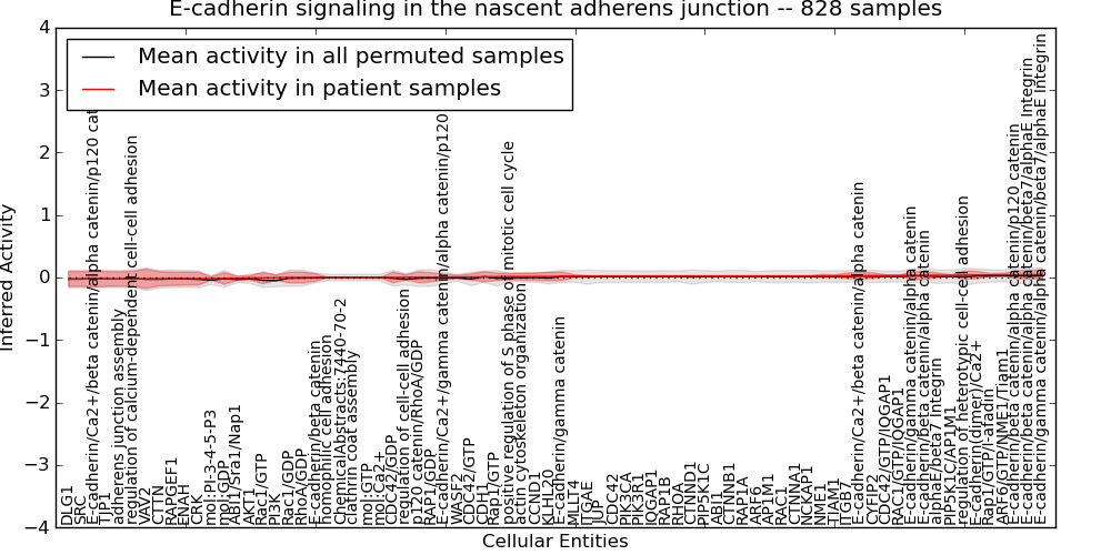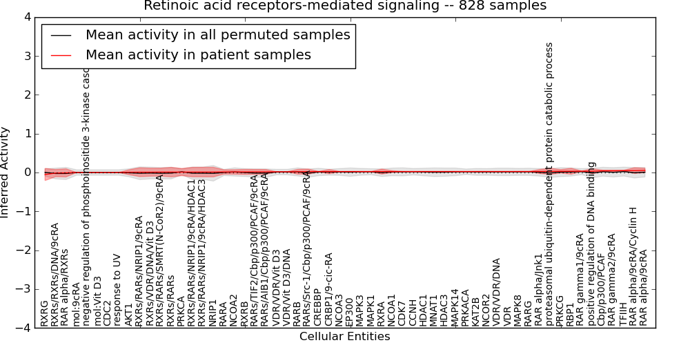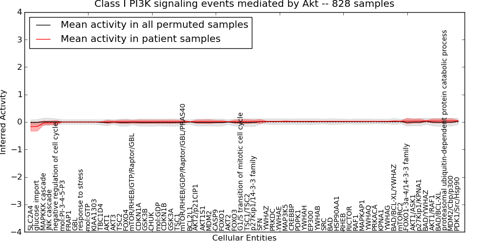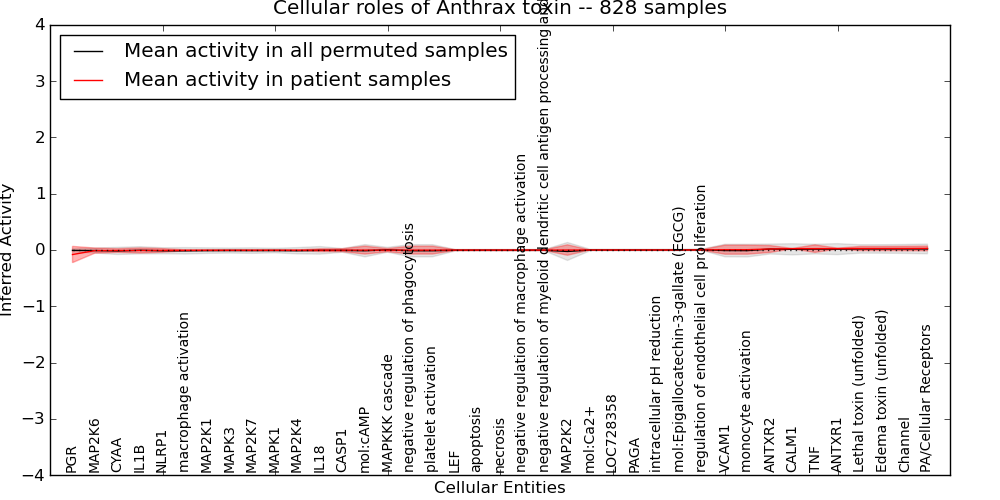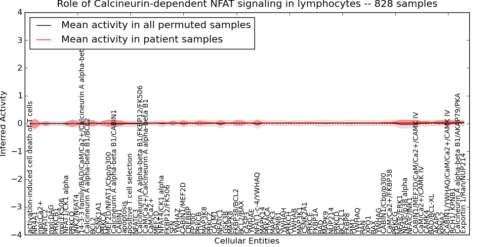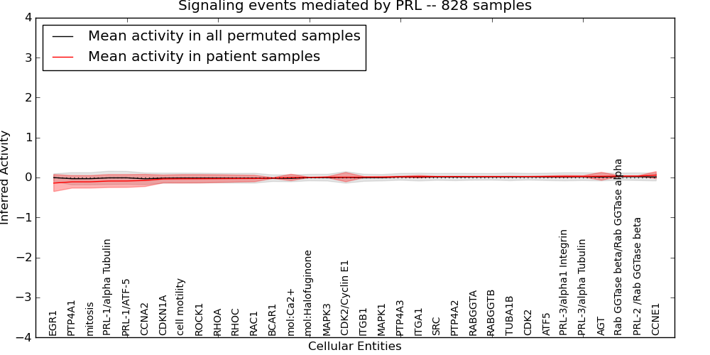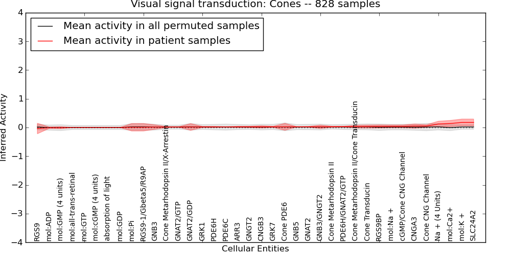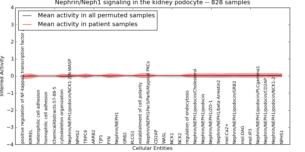 Figure S131. Get High-res Image This plot shows pathway concept perturbations across all samples against a permutation model. The concepts along the x-axis are sorted by lowest to highest mean activity for the real patient samples. Mean inferred activities are plotted along the y-axis as a colored band showing the average level and one standard deviation range. Real samples are shown in red and permuted samples in black.