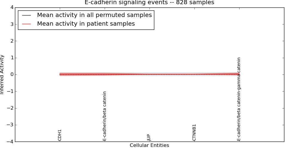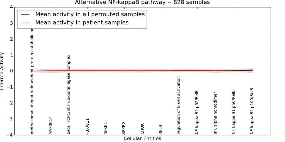 Figure S129. Get High-res Image This plot shows pathway concept perturbations across all samples against a permutation model. The concepts along the x-axis are sorted by lowest to highest mean activity for the real patient samples. Mean inferred activities are plotted along the y-axis as a colored band showing the average level and one standard deviation range. Real samples are shown in red and permuted samples in black.