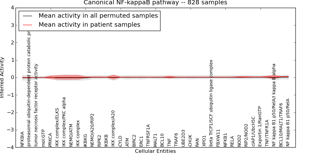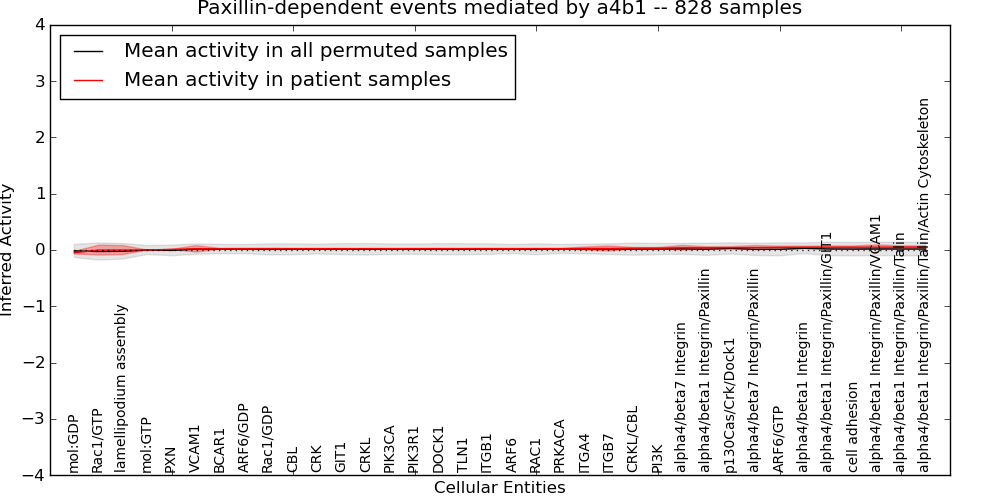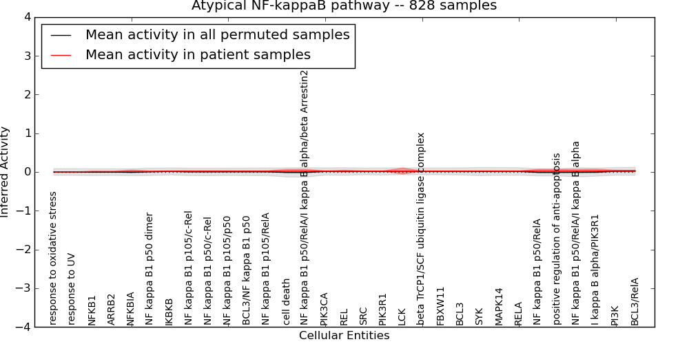 The significance of the IPL obtained for each concept in each patient sample is assessed using a permutation analysis. Importantly, the permutation analysis preserves data tuples so as to preserve any implicit correlations between the different data modalities. For example, genes that are deleted have concomitantly lower expression levels. Preserving the copy number and expression pairs therefore retains this data property. The simulation therefore makes "null samples" by permuting data tuples across all of the genes in the genome so that each gene in a null sample is associated with a random tuple of another gene with equal probability. This approach has the added benefit of preserving the pathway structure so that every observed IPL can be compared to a distribution of random IPLs derived from exactly the same interaction context. PARADIGM inferences are then obtained for 1000 "null" patients and serve as a background distribution to contrast the observed IPLs against. Pathway concepts are excluded from further analysis if they did not obtain a minimum IPL of 0.5 in any patient sample both observed or simulated.