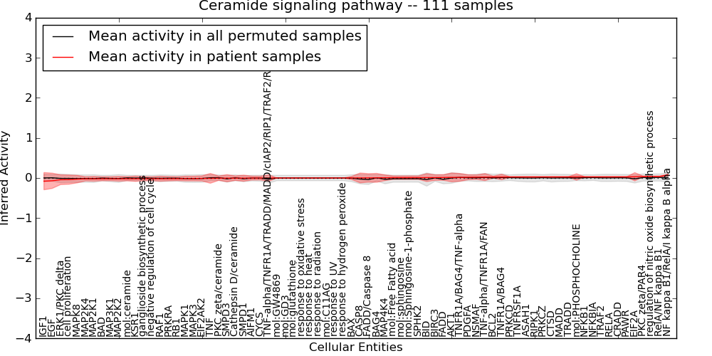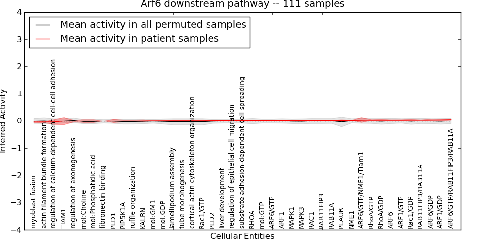 Figure S130. Get High-res Image This plot shows pathway concept perturbations across all samples against a permutation model. The concepts along the x-axis are sorted by lowest to highest mean activity for the real patient samples. Mean inferred activities are plotted along the y-axis as a colored band showing the average level and one standard deviation range. Real samples are shown in red and permuted samples in black.