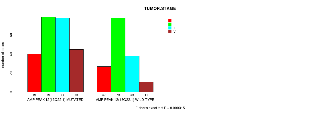 Amp Peak 12(13q22.1) cnv correlated to 'HISTOLOGICAL.TYPE' and 'TUMOR.STAGE'.