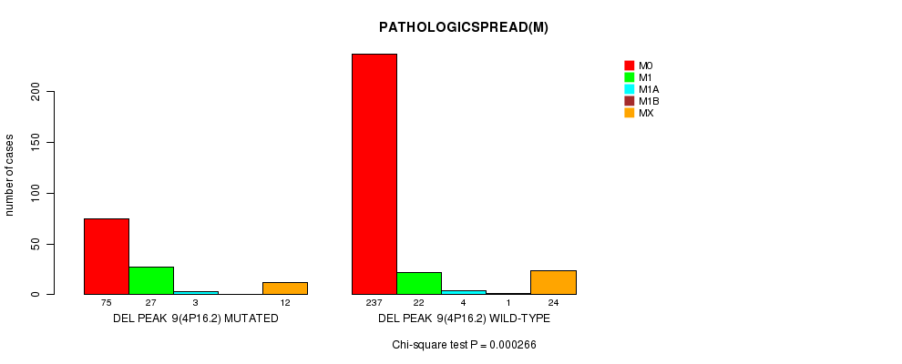 Del Peak 9(4p16.2) cnv correlated to 'Time to Death', 'PATHOLOGY.N', and 'PATHOLOGICSPREAD(M)'.