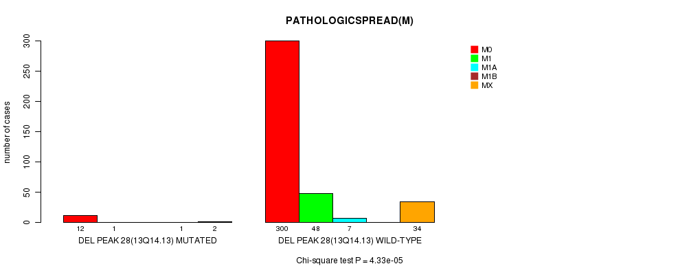 Del Peak 28(13q14.13) cnv correlated to 'PATHOLOGICSPREAD(M)'.