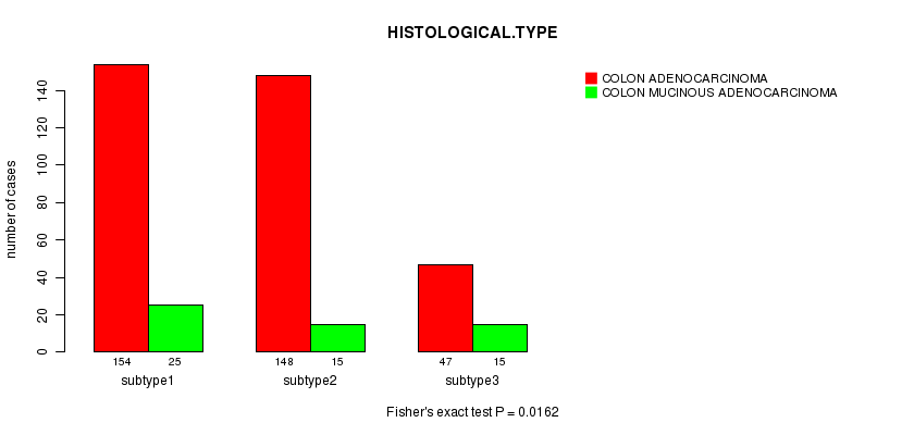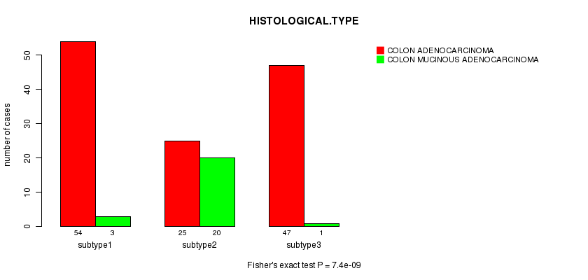 Consensus hierarchical clustering analysis on array-based mRNA expression data identified 3 subtypes that correlate to 'HISTOLOGICAL.TYPE'.