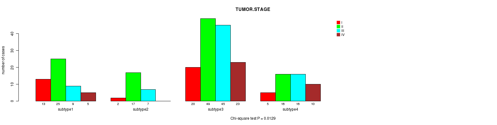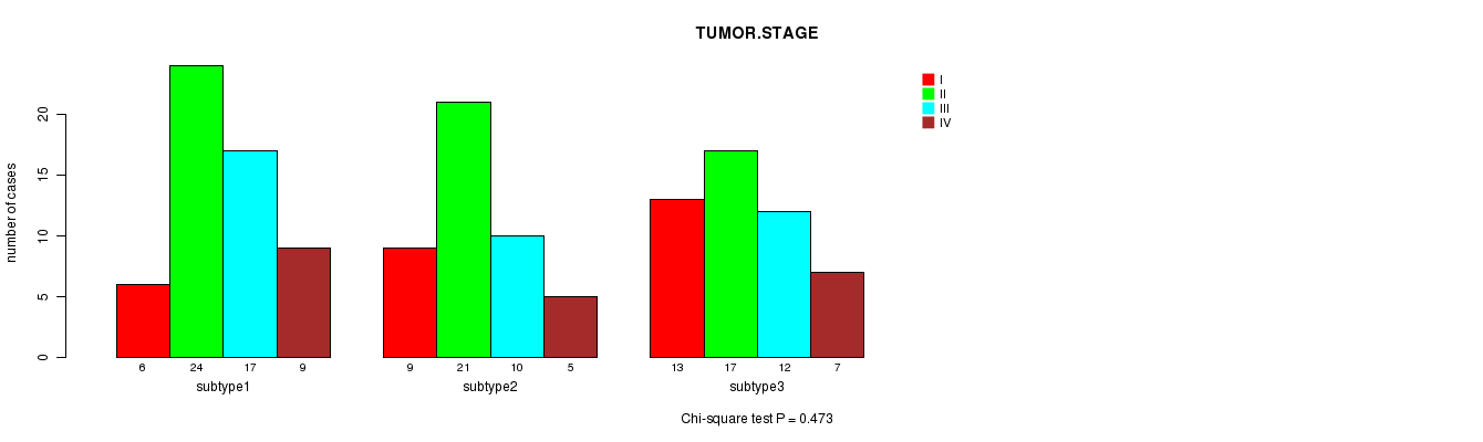 Figure S103. Get High-res Image Clustering Approach #10: 'MIRSEQ CHIERARCHICAL' versus Clinical Feature #8: 'TUMOR.STAGE'