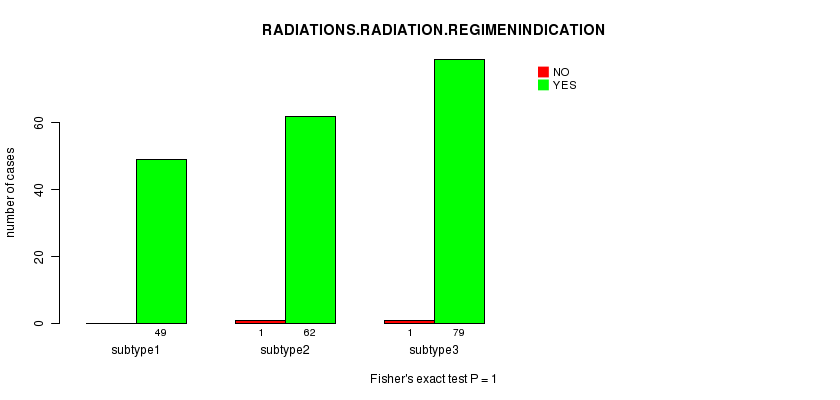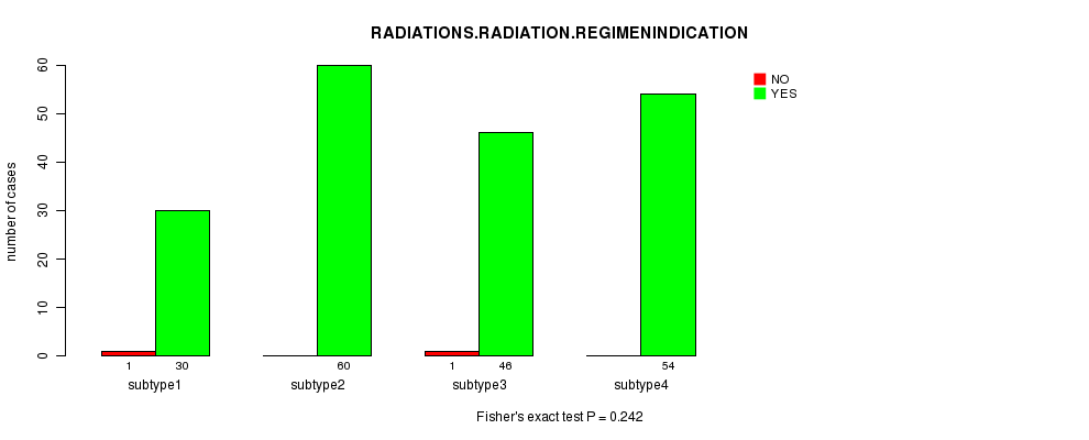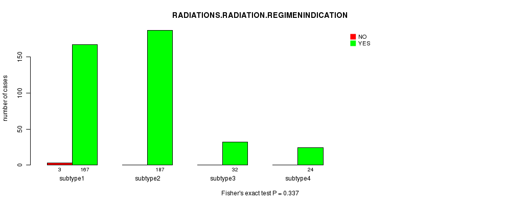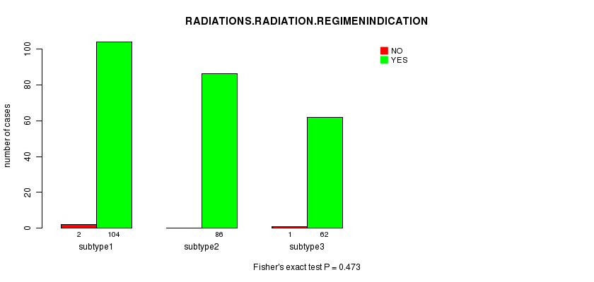 Figure S104. Get High-res Image Clustering Approach #10: 'MIRSEQ CHIERARCHICAL' versus Clinical Feature #9: 'RADIATIONS.RADIATION.REGIMENINDICATION'