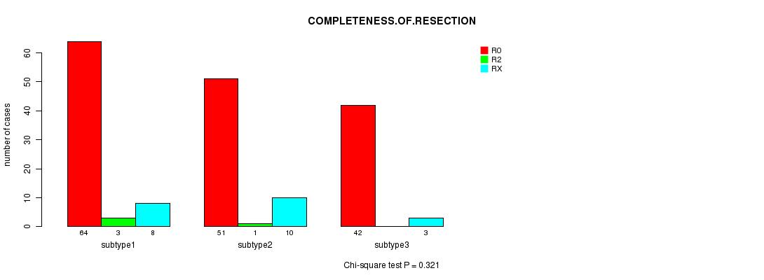 3 subtypes identified in current cancer cohort by 'MIRSEQ CHIERARCHICAL'. These subtypes correlate to 'PATHOLOGICSPREAD(M)' and 'COMPLETENESS.OF.RESECTION'.