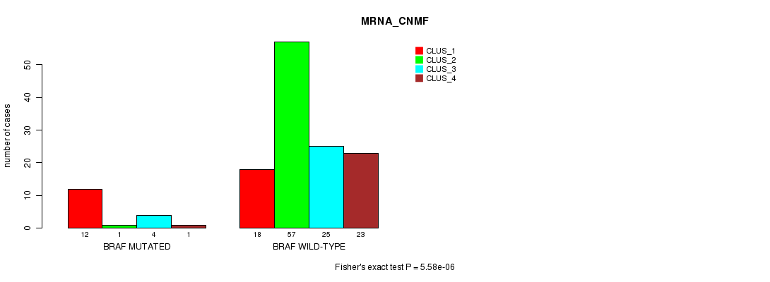 BRAF mutation correlated to 'MRNA_CNMF', 'MRNA_CHIERARCHICAL', and 'CN_CNMF'.