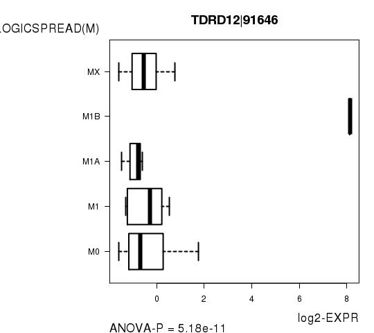 Figure S6. Get High-res Image As an example, this figure shows the association of TDRD12|91646 to 'PATHOLOGICSPREAD(M)'. P value = 5.18e-11 with ANOVA analysis.